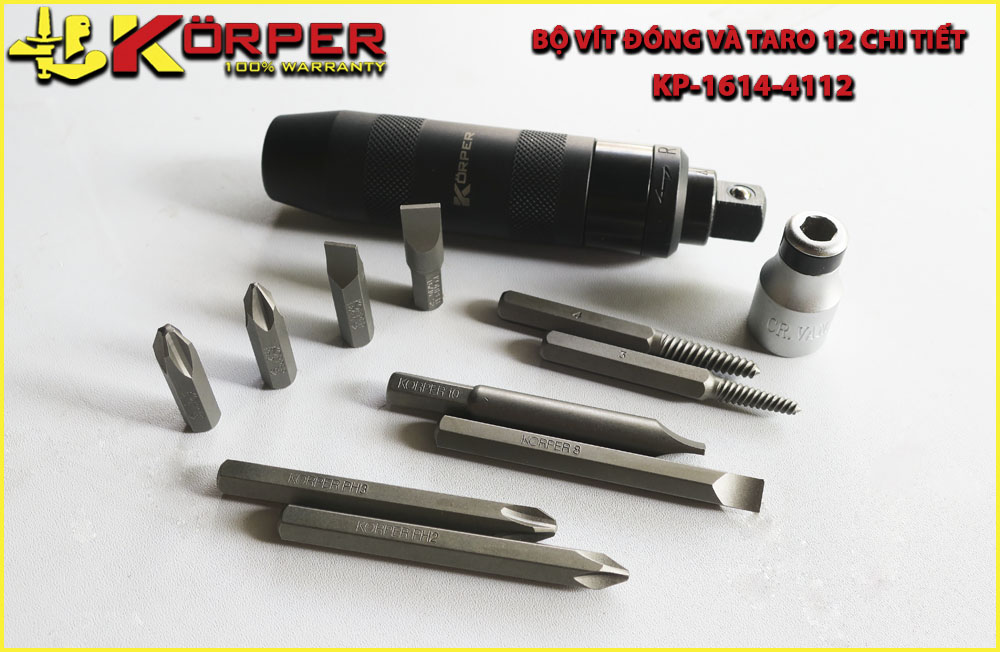 Bộ tô vít đóng và taro 12 chi tiết Korper KP-1614-4112 là bộ sản phẩm với nhiều chức năng riêng biệt, phù hợp dùng khi sửa chữa, bảo dưỡng thiết bị máy móc từ thô sơ đến chuyên dụng.