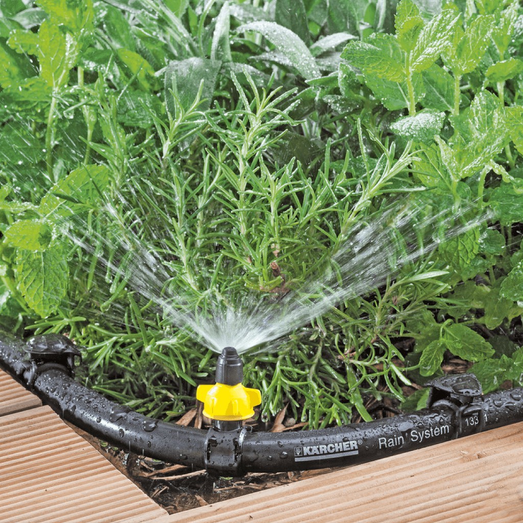 - Việc căn chỉnh góc phun có thể được điều chỉnh theo chiều ngang và chiều dọc nhờ đầu xoay. Trên vòi có thể điều chỉnh lượng nước từ 0 - 55 l / h tùy theo yêu cầu và nhằm bảo tồn tài nguyên, Bán kính vòi phun lan tỏa đến 1 mét. Hệ thống tưới nước Kärcher Rain System hiệu quả cao hoạt động với áp suất 4 bar, có vòi 1/2 "với vòng nhỏ giọt và vòi phun, đồng thời kết hợp các ưu điểm của tưới nhỏ giọt và tưới thông thường." Kärcher Rain System "có thể được điều chỉnh để hầu hết mọi khu vườn và hoạt động hoàn hảo với SensoTimer để kiểm soát việc tưới nước theo nhu cầu. ĐẶC ĐIỂM VÀ TÍNH NĂNG