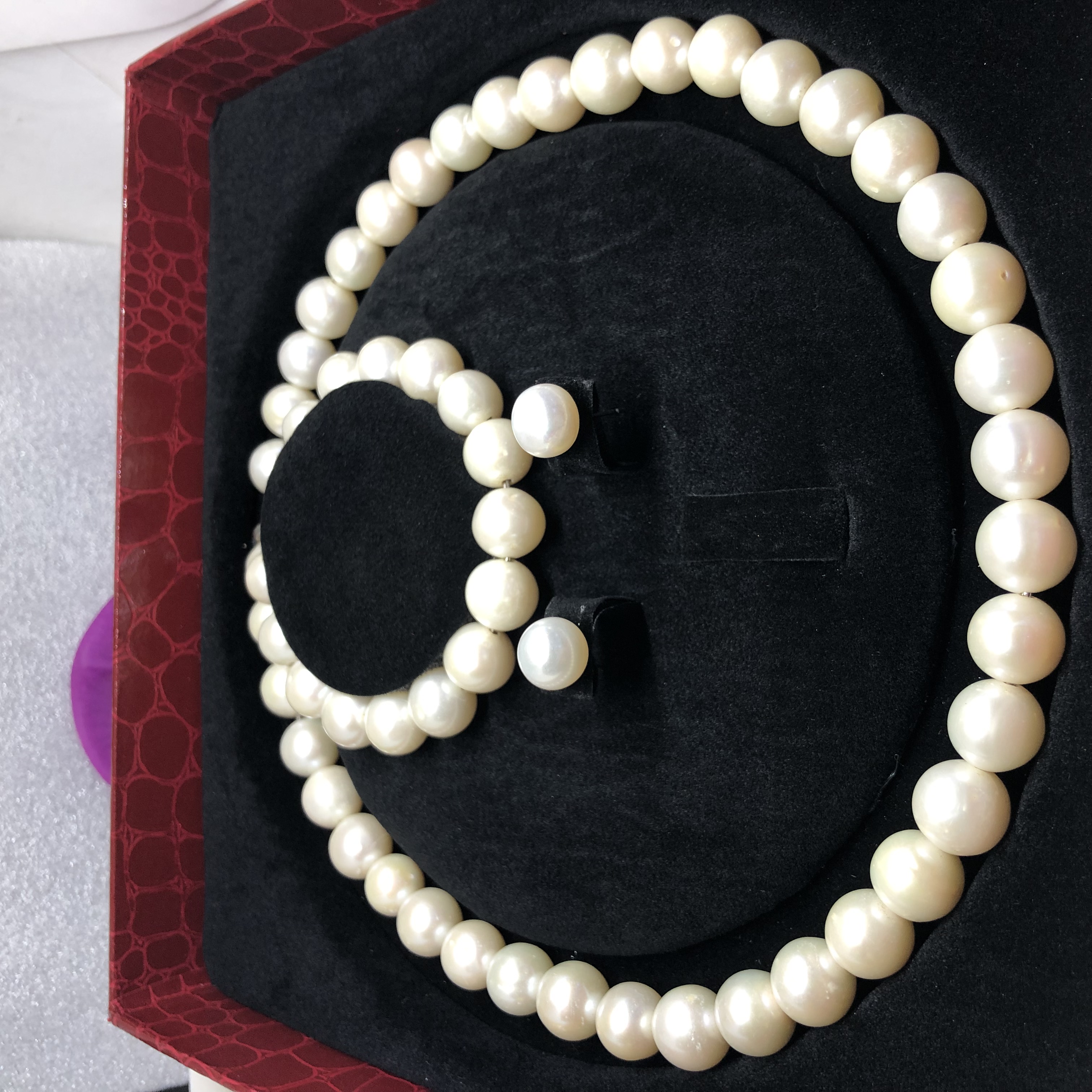 *** Bộ Ngọc Trai nuôi thiên nhiên gồm vòng cổ 40cm vòng tay 16cm-18cm khuyên tai kích thước bộ từ 8ly - 9ly. ** Hạt trai bóng đẹp bền rất nền nã. Hạt ngọc trai