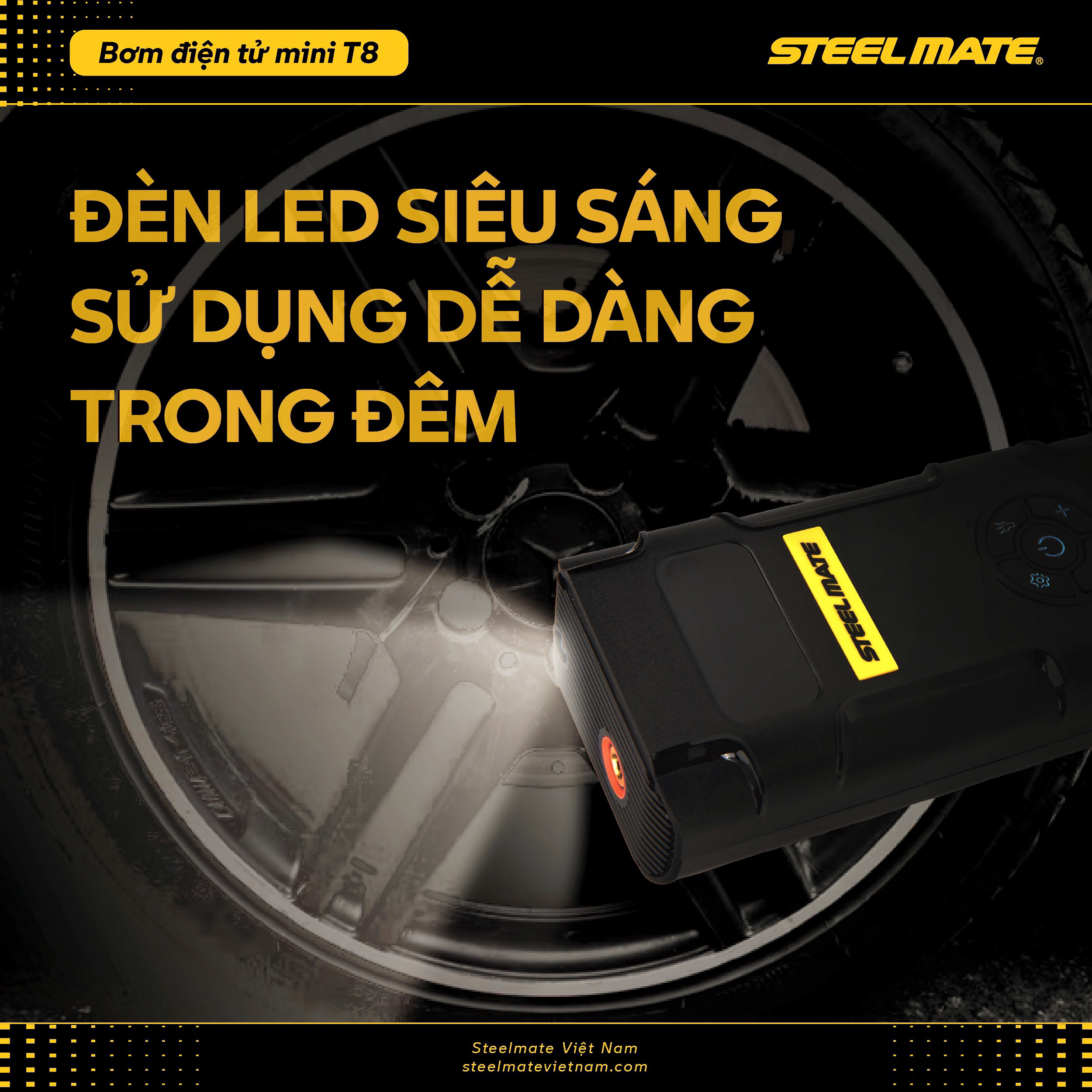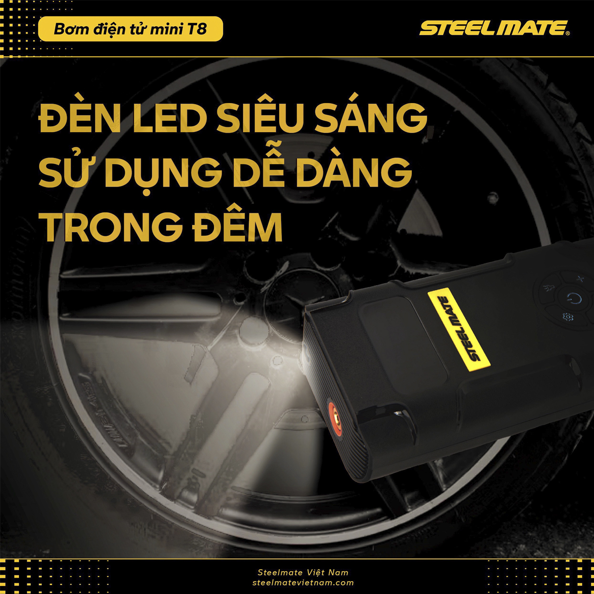 Bơm mini điện tử đa năng T8 STEELMATE CHÍNH HÃNG - Bơm điện tử thông minh tự động ngắt - Thiết lập trước áp suất - Tích hợp đèn LED khẩn cấp. Bơm điện tử