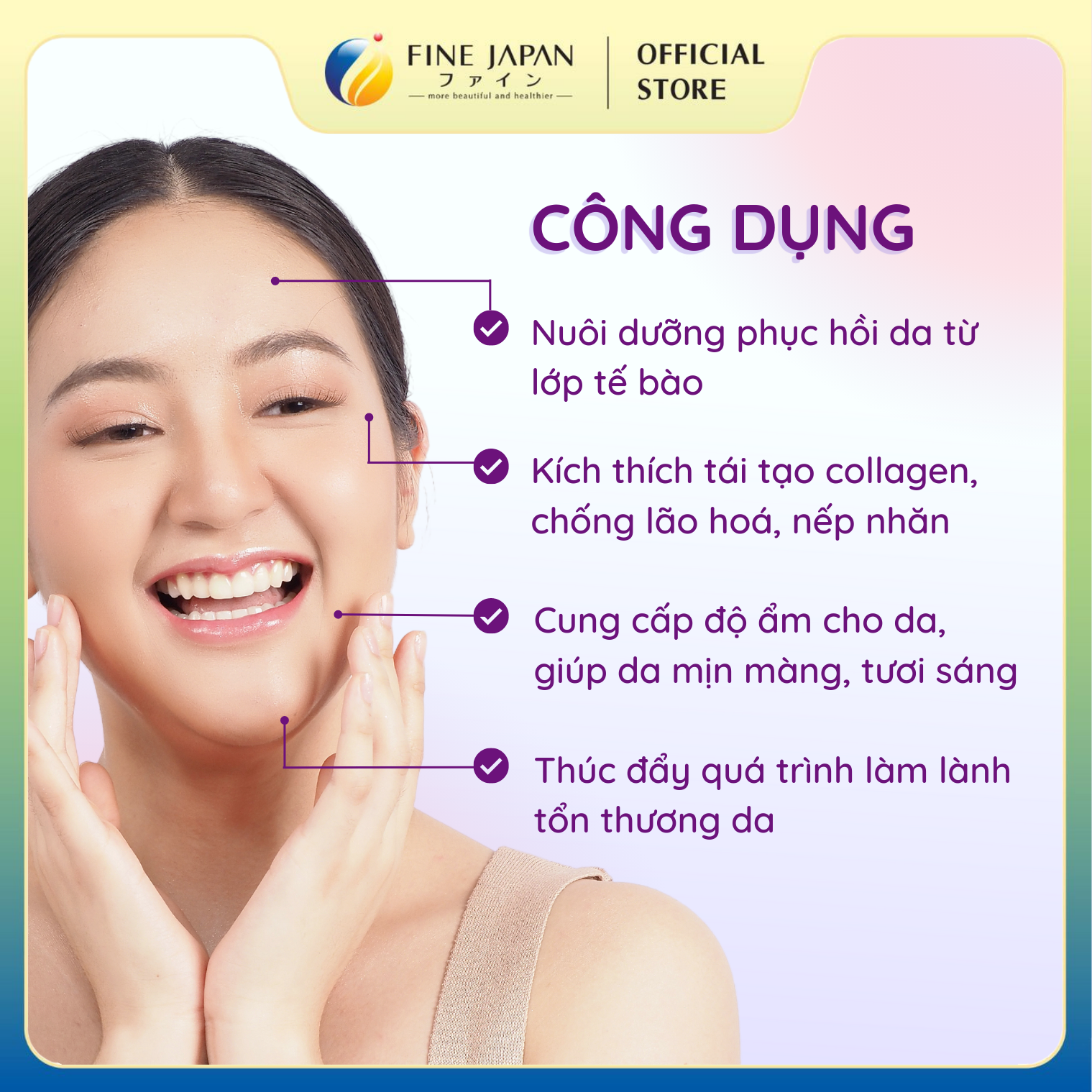 1. CÔNG DỤNG: Bổ sung collagen, vitamin E, C cho da. Hạn chế quá trình lão hóa da. Giúp da sáng mịn. Giảm thâm nám, sạm da. 2. PHÙ HỢP CHO CÁC ĐỐI TƯỢNG: