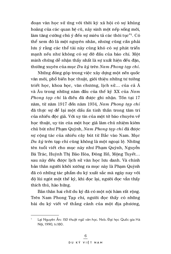 Những đóng góp của Tạp chí Nam Phong (1917 - 1934) trong việc xây dựng một nền quốc văn mới, phổ biến học thuật, giới thiệu những tư tưởng triết học, khoa học, văn chương, lịch sử… của cả Á và Âu trong những năm đầu của thế kỷ XX là điều đã được ghi nhận. Tồn tại 17 năm, từ năm 1917 đến năm 1934, Nam Phong tạp chí đã thực sự để lại một dấu ấn tinh thần trong tâm trí của nhiều độc giả. Với uy tín của một tờ báo chuyên về học thuật, uy tín của một học giả làm chủ nhiệm kiêm chủ bút như Phạm Quỳnh, Nam Phong tạp chí đã được sự cộng tác của nhiều cây bút từ Bắc vào Nam. Mục Du ký trên tạp chí cũng không là một ngoại lệ. Những tên tuổi viết cho mục này như Phạm Quỳnh, Nguyễn Bá Trác, Huỳnh Thị Bảo Hòa, Đông Hồ, Mộng Tuyết… sau này đều được lịch sử văn học lưu danh. Và chính bản thân người khởi xướng ra mục này là Phạm Quỳnh đã có những tác phẩm du ký xuất sắc mà ngày nay với độ lùi ngót một thế kỷ, khi đọc lại, người đọc vẫn thấy thích thú, hào hứng.