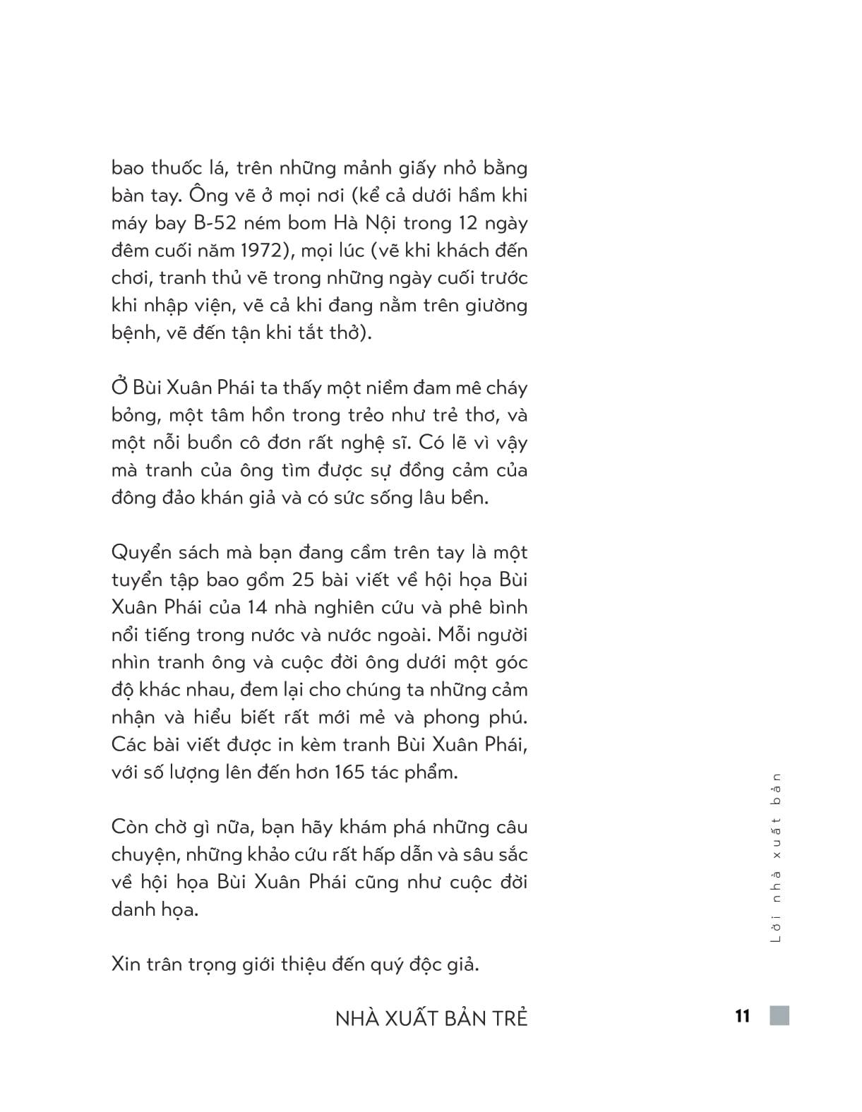 Quyển sách mà bạn đang cầm trên tay là một tuyển tập bao gồm 25 bài viết về hội họa Bùi Xuân Phái của 14 nhà nghiên cứu và phê bình, nhà sưu tập tranh, văn nghệ sĩ nổi tiếng trong nước và nước ngoài. Mỗi người nhìn tranh ông và cuộc đời ông dưới một góc độ khác nhau, đem lại cho chúng ta những cảm nhận và hiểu biết rất mới mẻ và phong phú.