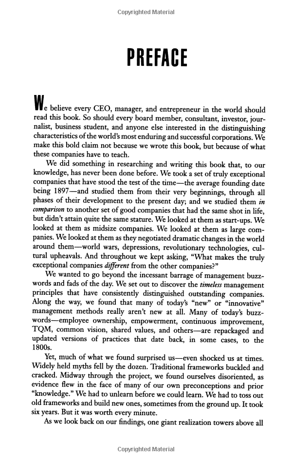 Drawing upon a six-year research project at the Stanford University Graduate School of Business, Collins and Porras took eighteen truly exceptional and long-lasting companies -- they have an average age of nearly one hundred years and have outperformed the general stock market by a factor of fifteen since 1926 -- and studied each company in direct comparison to one of its top competitors. They examined the companies from their very beginnings to the present day -- as start-ups, as midsize companies, and as large corporations. Throughout, the authors asked: "What makes the truly exceptional companies different from other companies?"