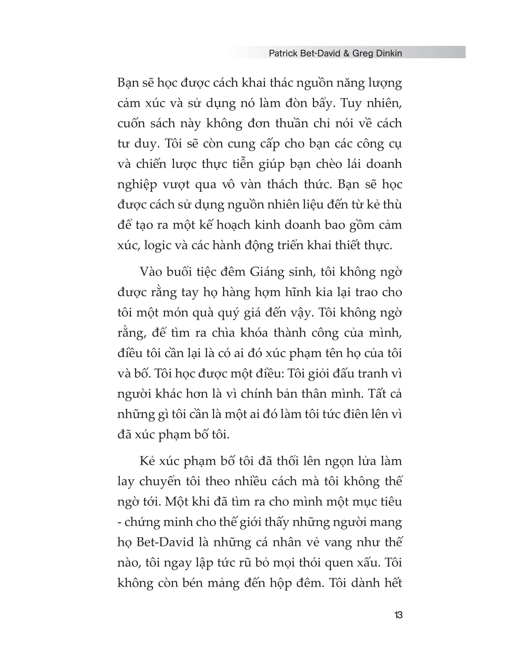 Trong cuốn “Business Planning: Phương pháp lập kế hoạch kinh doanh chi tiết và hiệu quả”, tác giả Patrick Bet-David hướng dẫn cách khai thác sức mạnh cảm xúc để xây dựng một kế hoạch kinh doanh vừa thực tế, vừa mang lại động lực lớn lao. Cuốn sách tập trung vào việc biến những khát khao thành chiến lược phát triển doanh nghiệp, tạo nên sự tăng trưởng bền vững qua nhiều thế hệ.