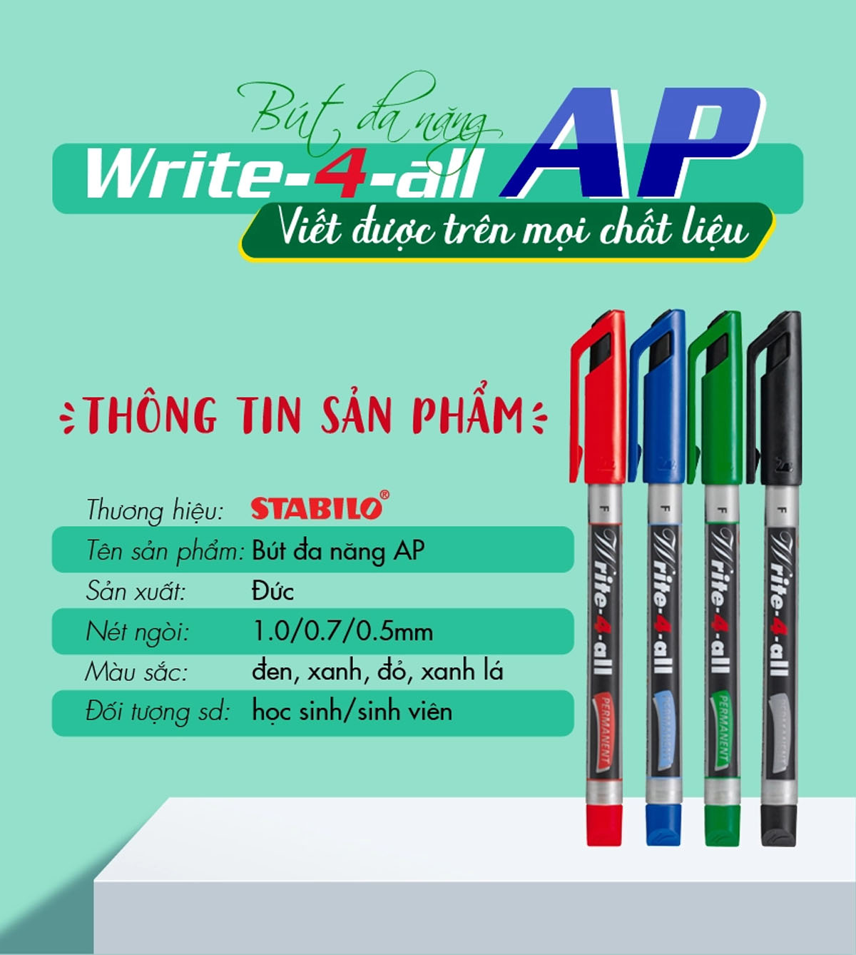 - Viết được trong mọi điều kiện môi trường khắc nghiệt: nóng, lạnh, mưa - Viết được trên mọi bề mặt trơn, tạo cảm giác thoải mái khi viết - Mực không chất độc hại,
