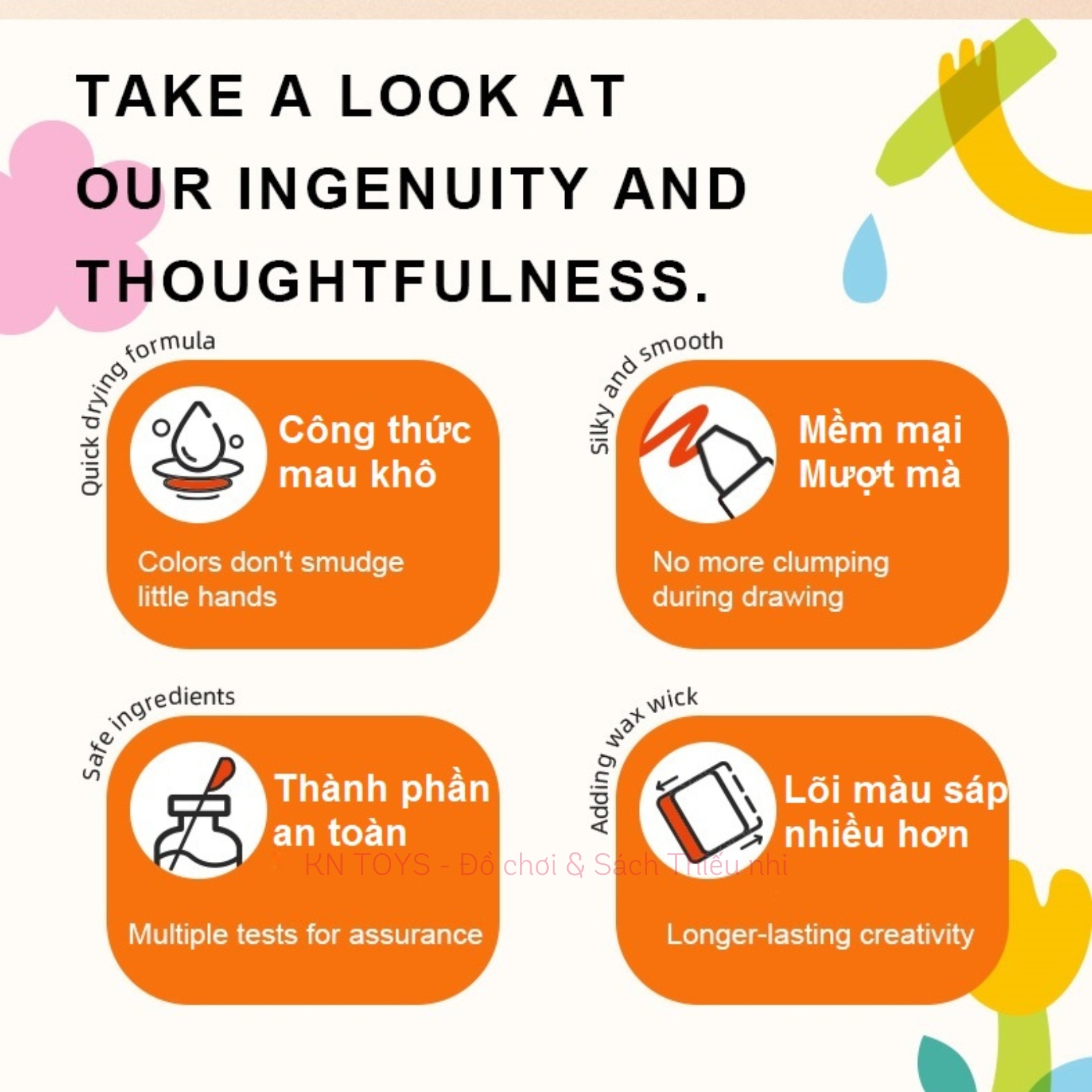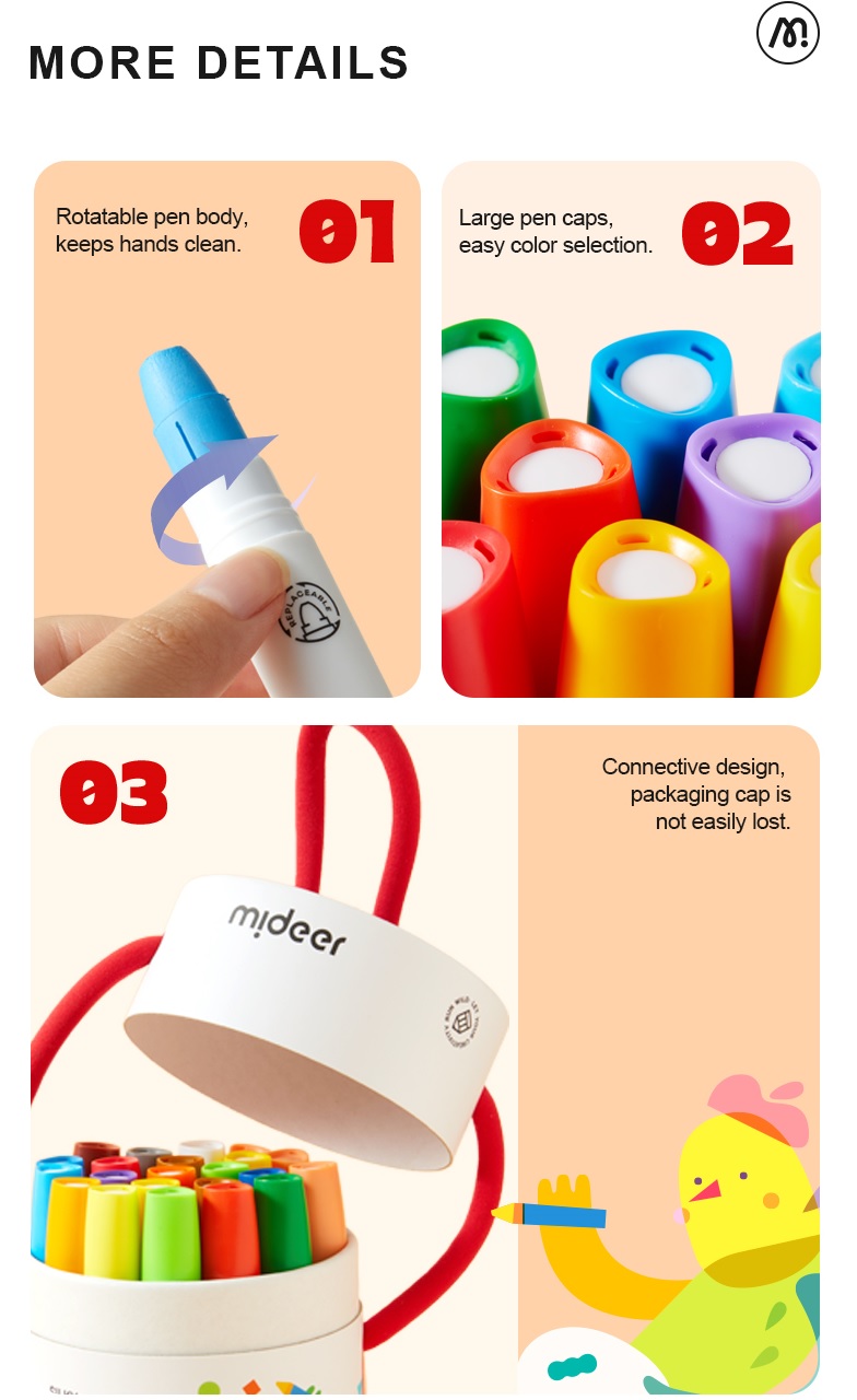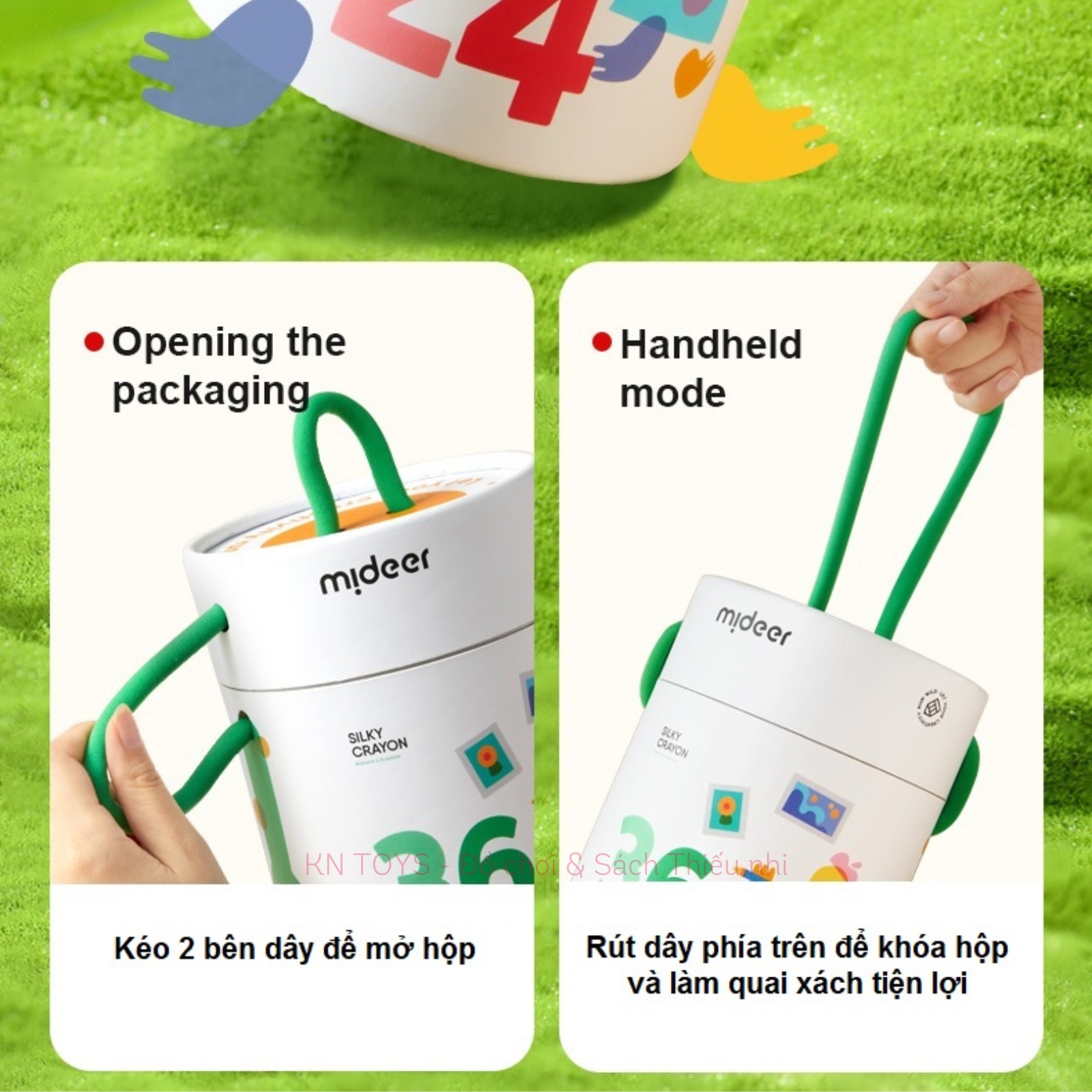 Bút sáp lụa tẩy rửa được của hãng Mideer giúp bé sẽ những phút giây thoả thích sáng tạo, tô tô vẽ vẽ theo ý thích, chắp cánh cho trí tưởng tượng bay xa mà không lo bẩn nhà.