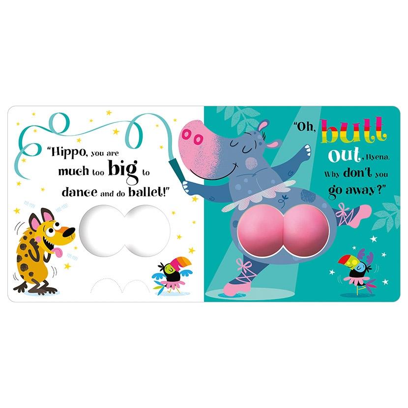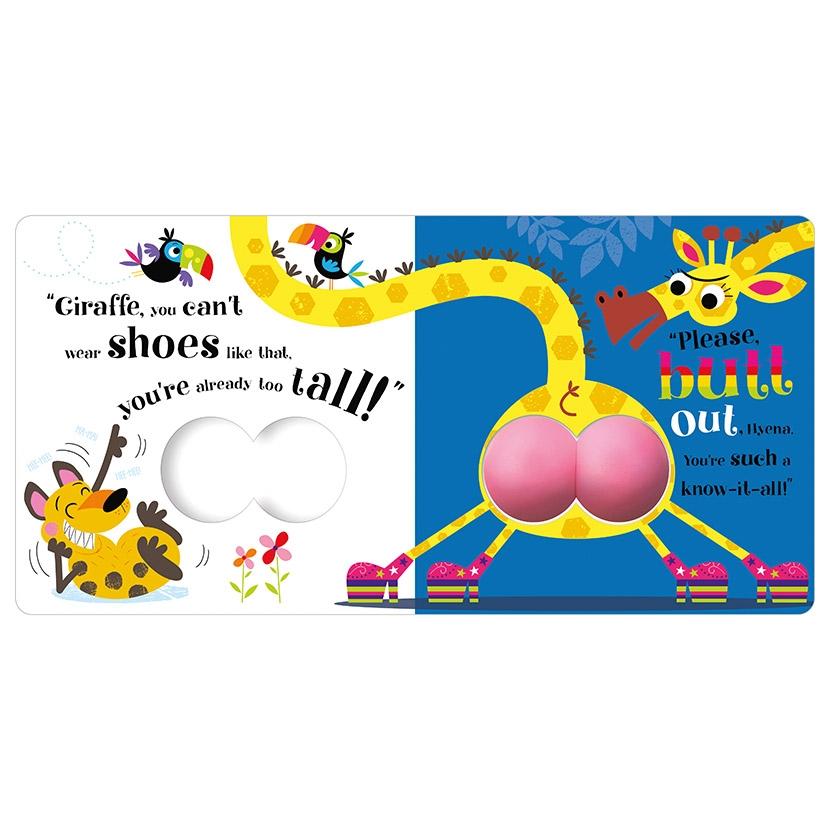 Butt Out! Join in with the animal friends as they teach Hyena a lesson about butting out.Children will love squishing the butts of various wild animals throughout this hilarious board book. The squidgy butt-shaped touch