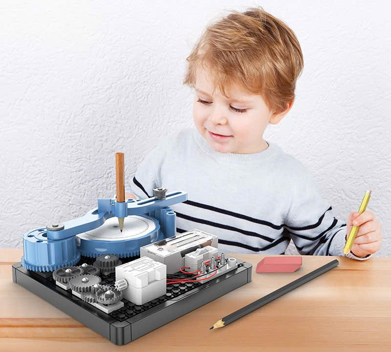'Bộ dụng cụ vẽ đa năng cho bé tự lắp ráp 37 chi tiết, vẽ được 48 hoa văn khác nhau, giúp bé vừa học nguyên lý cơ học, mạch điện đơn giản vừa phát