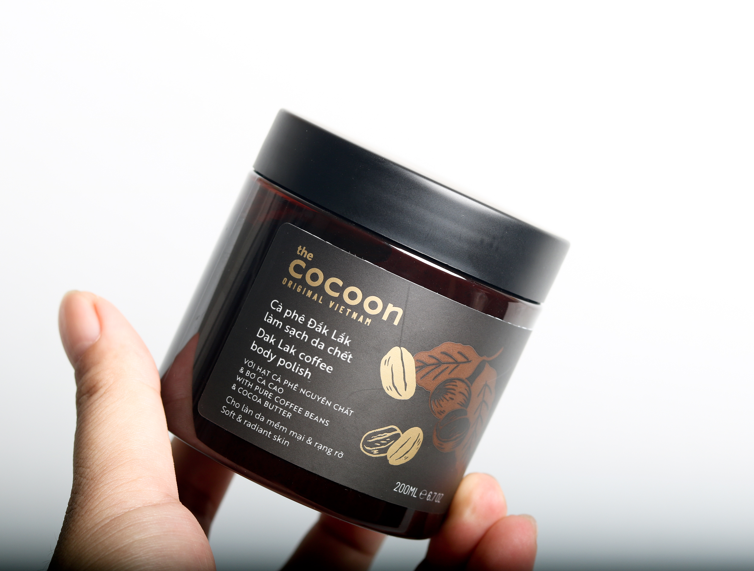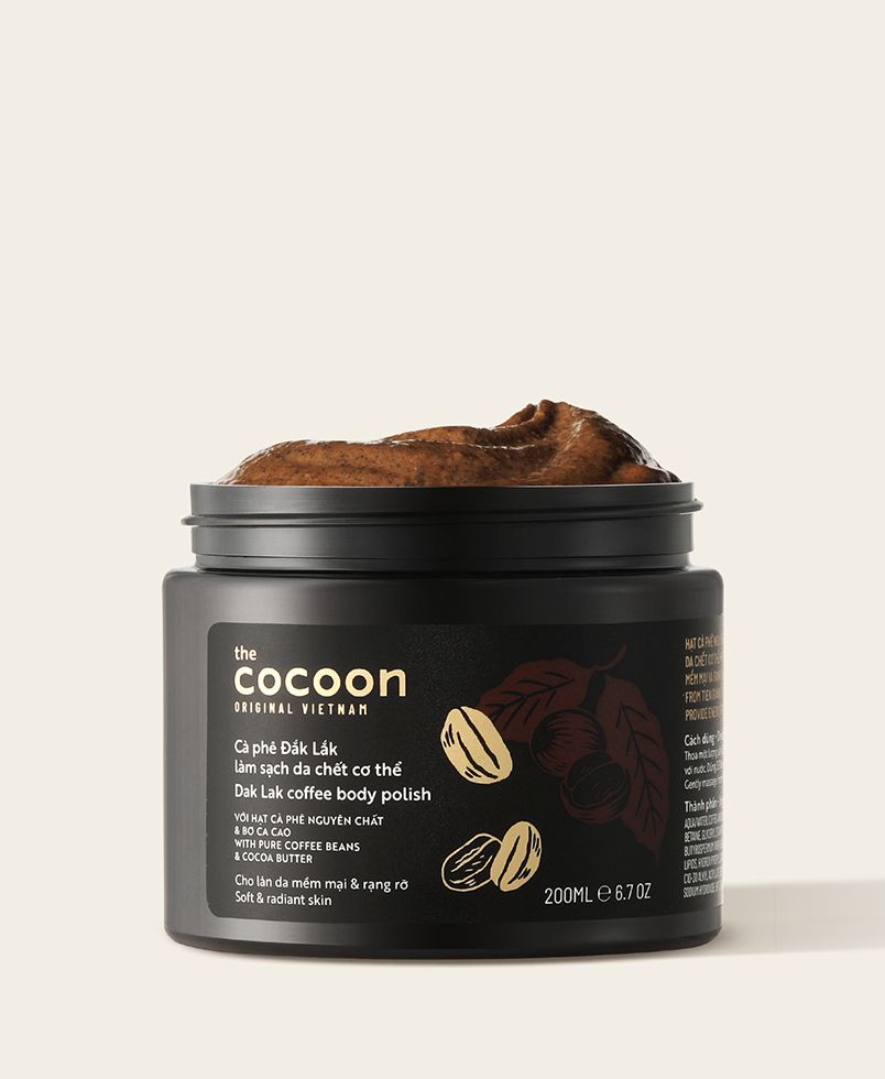 - Không vi hạt nhựa (no micro plastic beads) Cách dùng Cà phê Đăklăk làm sạch da chết: Thoa một lượng sản phẩm lên da ướt. Mát-xa nhẹ nhàng từ cổ đến chân, sau đó tắm sạch lại với nước. Dùng 2-3 lần một tuần để đạt kết quả tốt nhất. Thành phần đầy đủ Cà phê Đăklăk làm sạch da chết: Aqua/Water, Coffea Arabica (coffee) Seed Powder, Cetearyl Alcohol, Cocos Nucifera (coconut) Oil, Cocamidopropyl Betaine, Glyceryl Stearate, C15-19 Alkane, Glycerin, Ceteareth-20, Ceteareth-12, Theobroma Cacao (Cocoa) Seed Butter, Butyrospermum Parkii (shea) butter, Cetyl Palmitate, Glycine Soja (soybean) Sterols, Phospholipids, Glycolipids, Hydroxypropyl Starch Phosphate, Glycine Soja (Soybean) Oil, Parfum, Acrylates/C10-30 Alkyl Acrylate Crosspolymer, Tocopheryl Acetate, Xanthan gum, Phenoxyethanol, Sodium Hydroxide, BHT, Ethylhexylglycerin, Trisodium Ethylenediamine Disuccinate. Hạn sử dụng: 3 năm kể từ ngày sản xuất, in trên chai. Mở nắp dùng trong 12 tháng. Sản phẩm của The cocoon original VietNam