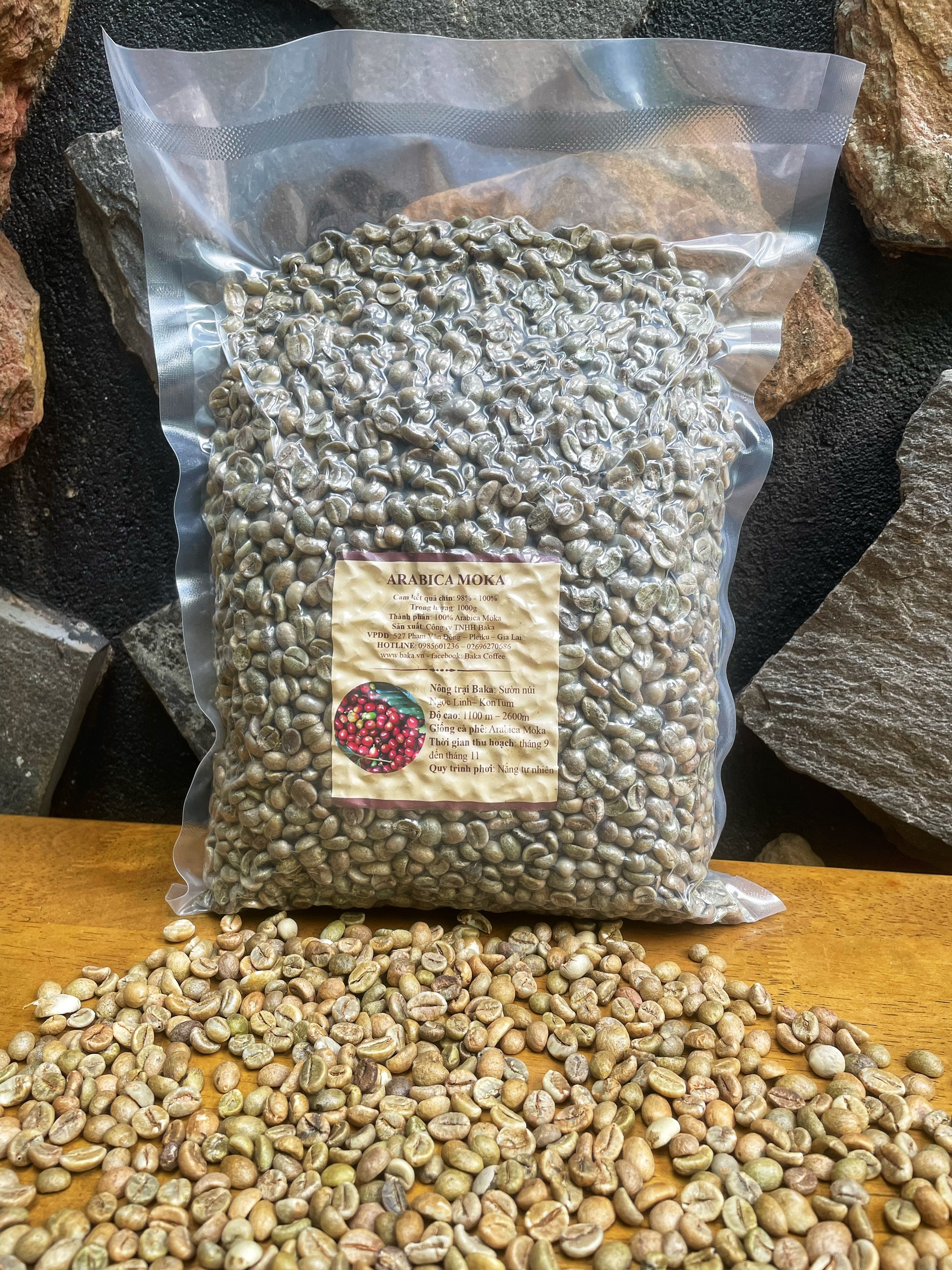 Cà phê nhân xanh Arabica Moka chưa qua chế biến. Moka của baka sử dụng nguyên liệu từ những vườn cà phê thuần arabica ít ỏi còn sót lại bên sườn núi Ngọc Linh, vùng