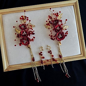 ✨Cài tóc cô dâu hoa vải đỏ đính pha lê kèm bông tai mẫu t12/2023