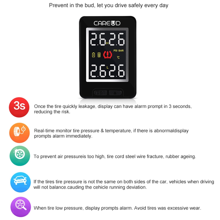 Cảm biến áp suất lốp trong cao cấp thương hiệu Careud dành cho các hãng xe - Cảnh báo áp suất, chính xác: ±1.5PSI (±0.1bar) - Điện áp: 8-16V - Hàng Nhập Khẩu Cảm