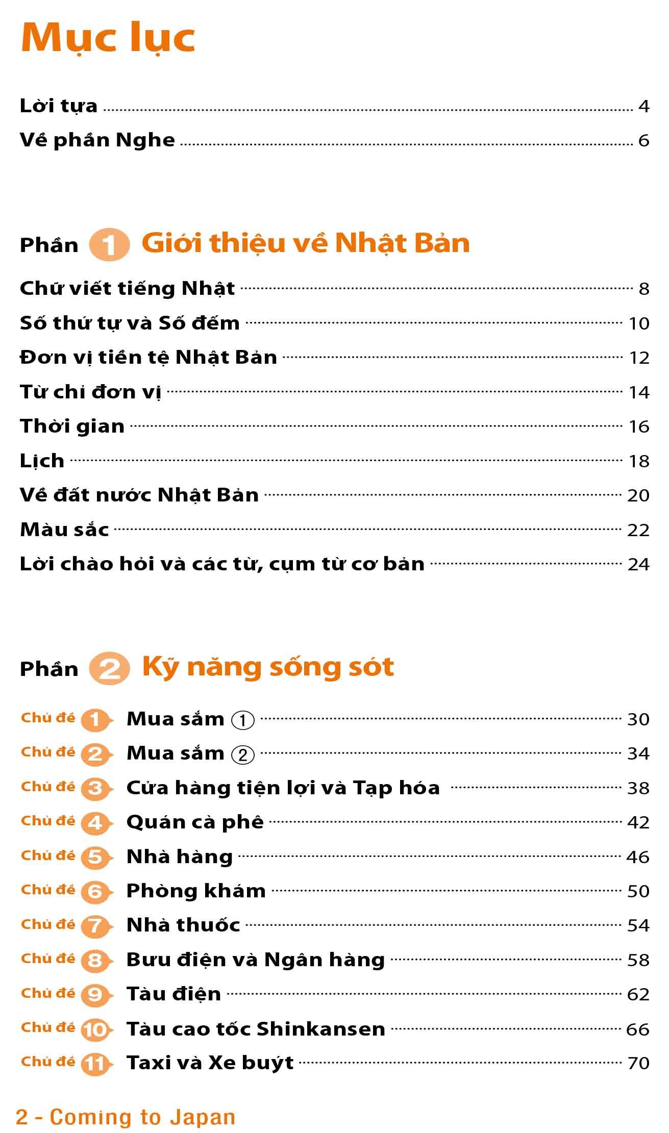 Phần 2 & 3: giới thiệu các từ và cụm từ tiếng Nhật hữu dụng khi đi mua sắm ở cửa hàng tiện lợi, giao tiếp ở nhà hàng và bệnh viện. Phần 3 hướng dẫn những từ và cụm từ tiếng Nhật được dùng trong những tình huống như giới thiệu về bản thân, sử dụng các phương tiện truyền thông hay hẹn gặp ai đó.