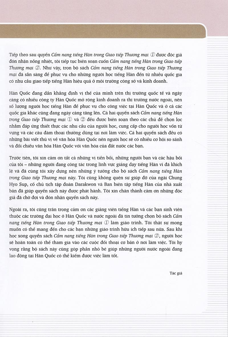 Mong rằng bộ sách Cẩm nang tiếng Hàn trong Giao tiếp Thương mại sẽ là một bộ giáo trình thiết thực, giúp ích cho các lao động người nước ngoài có thể học ngôn ngữ và tìm hiểu văn hoá Hàn quốc một cách dễ dàng và thú vị hơn. Mong rằng quyển sách này có thể giúp mở rộng vốn hiểu biết về ngôn ngữ tiếng Hàn cho mọi người.