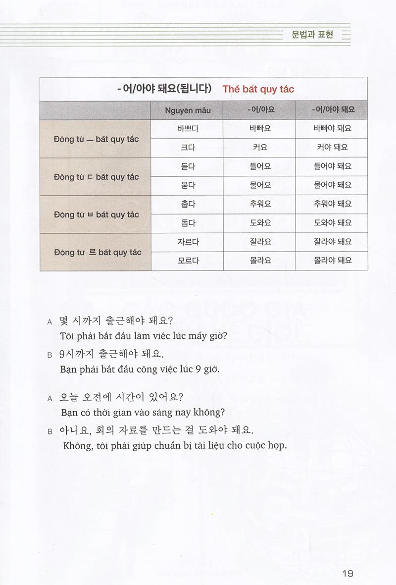 Tiếng Hàn Tổng Hợp Dành Cho Người Việt Nam - Sơ Cấp 1 Trong những năm gần đây, nhu cầu học tiếng Hàn và tìm hiểu về văn hóa Hàn Quốc đang có xu hướng tăng lên. Người học tiếng Hàn rất mong muốn có được một bộ giáo trình chuẩn, được biên soạn một cách tỉ mỉ và hữu ích nhất. Giáo trình tiếng Hàn tổng hợp lần đầu tiên được trao bản quyền chính thức tại Việt Nam Hiểu được điều đó, ngày 4-7, Đại diện chính phủ Hàn Quốc, ngài Woo Hyeong Min – Trưởng đại diện Văn phòng Quỹ giao lưu Quốc tế HQ tại Việt Nam cùng GS.TS.NGƯT Mai Ngọc Chừ – Chủ tịch Hội Nghiên cứu khoa học về Hàn Quốc của Việt Nam (KRAV) đã trao quyết định cho phép Công ty Cổ phần sách MCBooks của Việt Nam được xuất bản cuốn sách này tại thị trường Việt Nam. Và đây chính là bộ giáo trình tiếng Hàn tổng hợp đầu tiên có bản quyền chính thức có mặt tại Việt Nam. Cũng theo ông Woo Hyeong Min, Thực tế đây là bộ giáo trình chính thống mà tất cả người học tiếng Hàn tại Việt Nam cần sử dụng. Tuy nhiên nhiều năm qua bộ sách đến tay người dùng đều là sách lậu nên chưa đạt được kết quả mà chính phủ Hàn muốn mang tới Việt Nam. Do đó Chính phủ Hàn Quốc đã quyết định tìm 1 đơn vị xuất bản uy tín của Việt Nam để giúp họ mang đến cho người học những cuốn sách tiếng Hàn chất lượng tốt với giá cả hợp lý. Bộ giáo trình được Hội nghiên cứu khoa học Hàn Quốc của Việt Nam biên soạn và hiệu đính. Bộ giáo trình sẽ giúp nâng cao hiệu quả trong việc sử dụng ngôn ngữ Hàn sau tiếng mẹ đẻ và tiếng Anh, là nền tảng giúp người lao động Việt Nam nhận được những vị trí làm việc cao trong doanh nghiệp Hàn Quốc. Đây cũng là cách để thúc đẩy quan hệ hợp tác về văn hoá và giáo dục giữa hai nước trong thời gian tới. Giới thiệu cuốn Giáo trình tiếng Hàn tổng hợp dành cho người Việt Nam – Sơ cấp 1 Giáo trình tiếng Hàn tổng hợp dành cho người Việt Nam – Sơ cấp 1 được biên soạn dành cho người Việt Nam muốn học tiếng Hàn ở trình độ sơ cấp. Sách được biên soạn nhằm hướng tới việc sử dụng được trong các tiết học tiếng Hàn tại giảng đường đại học nên mỗi bài học được chia thành nhiều phần như: Lý thuyết cơ bản gồm từ vựng và cấu trúc ngữ pháp; phần luyện tập theo 4 kỹ năng giao tiếp như: Nghe – Nói – Đọc – Viết, phần luyện phát âm, phần tìm hiểu văn hóa… Các chủ đề trong sách được sắp xếp một cách có hệ thống và liên quan chặt chẽ với nhau. Giáo trình tiếng Hàn tổng hợp được biên soạn kèm theo một cuốn sách bài tập hỗ trợ giúp người học ôn tập kỹ hơn và có thể luyện tập nâng cao trong những trường hợp cần thiết. Nội dung trong Giáo trình tiếng Hàn tổng hợp – Sơ cấp 1 2 cuốn sách trong bộ Sơ cấp được xây dựng với 30 bài khóa và bảng chữ cái. Trong đó quyển 1 gồm phần bảng chữ cái và 15 bài đầu. Học hết quyển 1, bạn sẽ học đến quyển sơ cấp 2 với 15 bài còn lại. Cấu trúc tổng thể của giáo trình được xây dựng theo các chủ đề; mỗi chủ đề được liên kết thống nhất với một hệ thống các từ vựng và cấu trúc ngữ pháp cơ bản, bài tập ứng dụng, kỹ năng và tìm hiểu văn hóa. Trong mỗi bài học, nội dung học được chia thành các phần như: luyện từ vựng, luyện ngữ pháp cơ bản, luyện tập kỹ năng nghe – nói – đọc – viết, luyện phát âm, tìm hiểu văn hóa của đất nước Hàn Quốc xinh đẹp. Và kết thúc mỗi bài đều có thêm bảng từ mới xuất hiện trong bài học. Phần cuối của sách, các tác giả đưa ra hệ thống từ mới được sắp xếp theo thứ tự của bảng chữ cái. Đây là những từ không xuất hiện trong phần ngữ pháp, từ vựng cơ bản; nhưng lại xuất hiện nhiều ở phần luyện tập của từng bài.