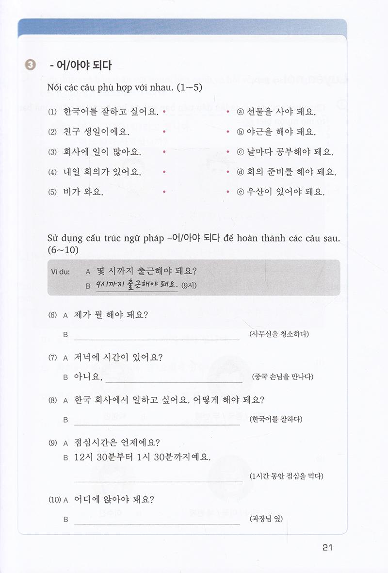 Sách bài tập Tiếng Hàn tổng hợp trung cấp 4 – Luyện càng nhiều nhớ càng lâu Hiện nay đa số người học đều gặp phải khó khăn trong việc hiểu và ghi nhớ kiến thức. Đặc biệt là khi kiến thức được nâng cao hơn thì khó khăn này cũng tăng lên. Nhiều người thường lúng túng khi gặp phải các tình huống ứng dụng thực tế hay gặp khó khăn khi làm các bài kiểm tra năng lực tiếng Hàn. Từ đó dẫn đến sự chán nản, thành tích tiếng Hàn tụt giảm và sinh ra tâm lý chán nản, muốn từ bỏ việc học tiếng Hàn Chính vì vậy cần có một cuốn sách bài tập bổ trợ cho sách giáo trình giúp người học được ôn tập, luyện tập, giải quyết vấn đề về ghi nhớ và ứng dụng kiến thức. Và người học cần sử dụng sách bài tập tiếng Hàn tổng hợp trung cấp 4 để ôn tập luyện tập kiến thức đã học từ giáo trình. Sau khi sử dụng sách bài tập người học có thể ghi nhớ sâu hơn từ mới, ngữ pháp đã học, làm quen với các tình huống sử dụng kiến thức thông qua các bài tập ứng dụng cụ thể ở mỗi bài. Đồng thời người học cũng có thể rèn luyện, nâng cao kỹ năng nghe – nói – đọc – viết của bản thân. Nội dung sách bài tập Tiếng Hàn tổng hợp dành cho người Việt Nam trung cấp 4 phiên bản mới gồm: Sách bài tập Tiếng Hàn tổng hợp trung cấp 4 được biên soạn gồm 15 bài, chủ đề của mỗi bài sẽ tương ứng với sách giáo trình, mỗi bài lại gồm 3 phần chính. Ở cuối sách là phần đáp án chi tiết giúp người học có thể tự so sánh đáp án và kiểm tra lại bài làm của mình. Nội dung từng bài sẽ gồm những phần chính sau: Phần 1: Luyện tập từ vựng, giúp người học ôn tập và luyện tập từ vựng, ứng dụng vào các câu, tình huống cụ thể. Các từ vựng được đưa ra trên cơ sở phù hợp với nội dung và chủ đề được học trong giáo trình Tiếng Hàn tổng hợp trung cấp 4. Phần 2: Luyện tập ngữ pháp, giúp người học luyện tập các ngữ pháp tương ứng với ngữ pháp trong giáo trình. Bài tập được phân từ cơ bản đến nâng cao giúp người học có thêm kiến thức chuyên sâu vận dụng trong thực tế. Phần 3: Ôn luyện tổng hợp các kỹ năng giao tiếp như: nghe – nói – đọc – viết. Đặc biệt trong phần này còn có những bài luyện đa dạng nhằm nâng cao năng lực hoạt động thực tế cho người học. Điểm ưu việt của Bài tập tiếng Hàn tổng hợp dành cho người Việt Nam trung cấp 4 phiên bản mới Tiếng Hàn tổng hợp dành cho người Việt Nam được ra đời vào năm 2008 dưới sự kết hợp giữa đội ngũ chuyên gia hàng đầu tại Hàn Quốc và Việt Nam. Tuy nhiên, thực tế ở Việt Nam trong hơn 10 năm qua, sách đến tay người học đa số là sách lậu.