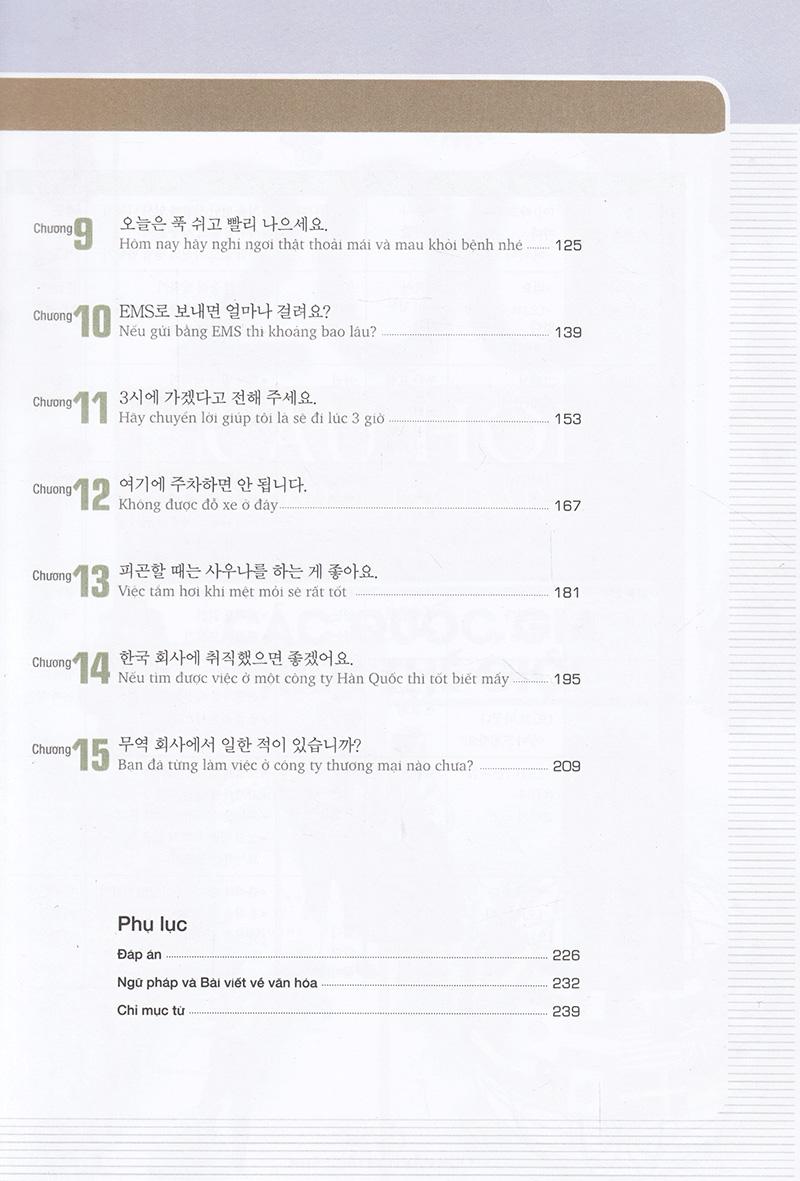 Mỗi cuốn giáo trình được chia thành 15 chương. Từ chương 1 đến chương 5 giúp người học làm quen với các chữ viết trong tiếng Hàn và các cấu trúc câu cơ bản. Từ chương 6 đến chương 15 đề cập đến những chủ đề trong cuộc sống hàng ngày và trong môi trường công sở, giúp người học làm quen với các đoạn hội thoại, từ vựng, ngữ pháp cũng như các phần bài tập và giúp tìm hiểu về văn hoá Hàn Quốc.