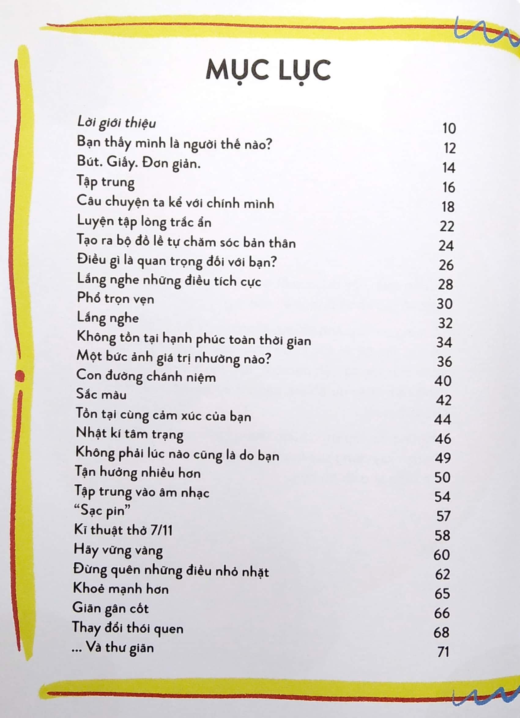 Những bài thực hành trong cuốn sách giúp bạn nhận diện ra cảm xúc của mình, thêm bí kíp kiểm soát tâm trạng, và có nhiều mẹo sáng tạo để thấy hạnh phúc và yêu đời hơn, giải toả stress và lấy thăng bằng trong cuộc sống.
