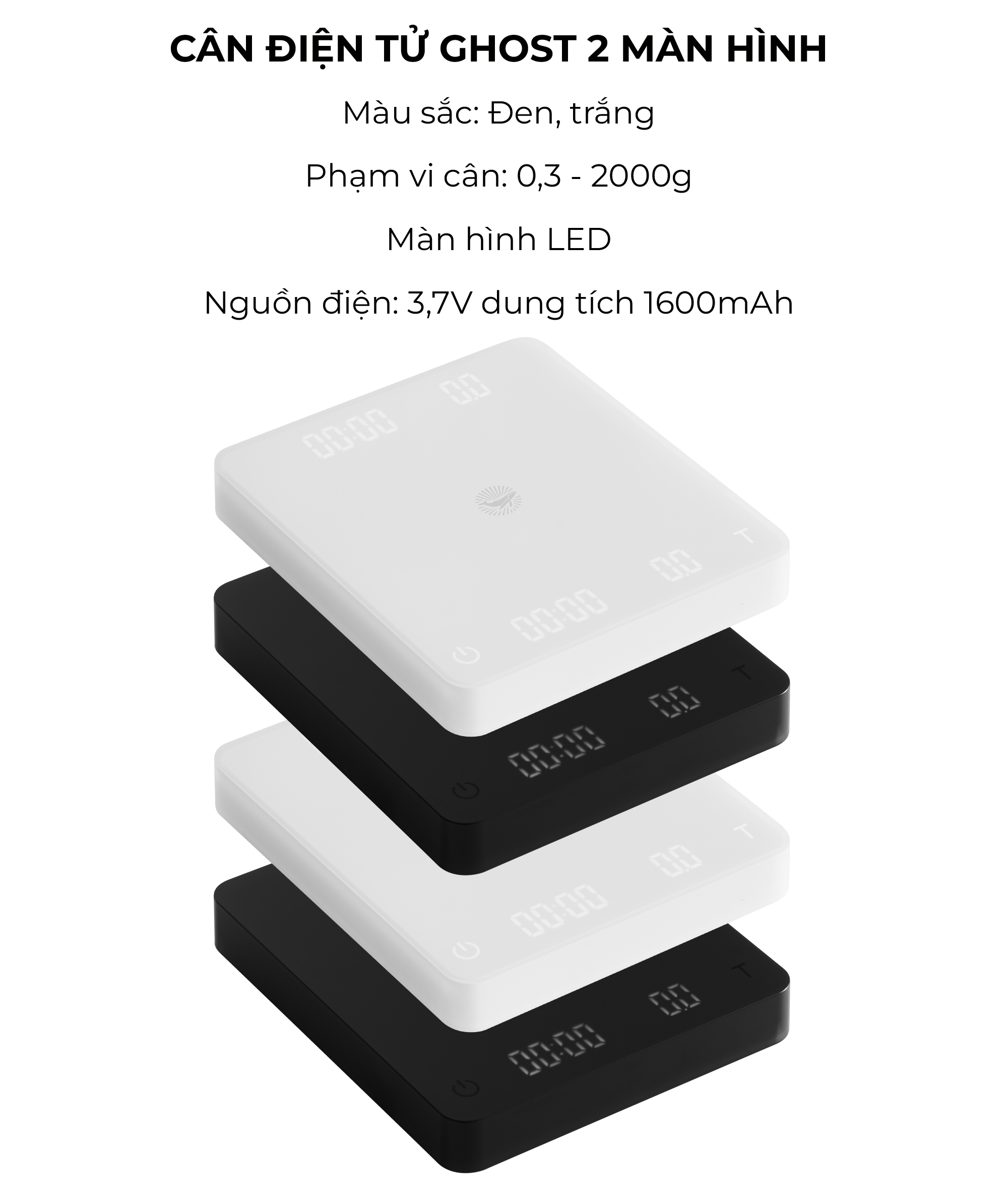 CÂN ĐIỆN TỬ GHOST 2 MÀN HÌNH HIỂN THỊ   Với ngôn ngữ thiết kế vuông bo tròn ở cạnh giản đơn, hiện đại và nhỏ gọn. Nhưng được trang bị những tính năng chuẩn nhất. Một sản phẩm công nghệ phục vụ cho dân barista chuyên nghiệp.   Cân với bề mặt kính sang trọng, cao cấp và rất dễ lau sạch. CHỨC NĂNG NỔI BẬT   Tính năng độc đáo DUAL SCREEN với 2 màn hình hiển thị trạng thái giúp barista và khách hàng (hoặc học viên) cùng lúc quan sát được thông tin hiển thị của quá trình pha.   Sử dụng pin Lithium sạc lại qua cổng USB type C tích hợp thêm khe cắm pin mở rộng với 3 viên AAA giúp cân hoạt động liên tục trong trường hợp không thể sạc.   Thời gian phản hồi cực nhanh – 50ms kể từ khi có thay đổi về khối lượng trên cân.   Tự động tắt khi không sử dụng   Màn hình LED siêu sáng: Sử dụng trong mọi điều kiện ánh sáng kể cả tắt đèn thường chỉ xuất hiện trên những dòng cân cao cấp hơn như Acaia hoặc Brewista.   Tự động tắt đèn sau 15s.   Phím bấm cảm ứng: Quá nhẹ nhàng khi sử dụng.   Bề mặt cân rộng rãi: Để cả 1 bình pha Chemex 6 cup lên mà vẫn thoải mái.   Tích hợp bộ đếm thời gian: Dành cho những ai sử dụng cân pha Pour over.