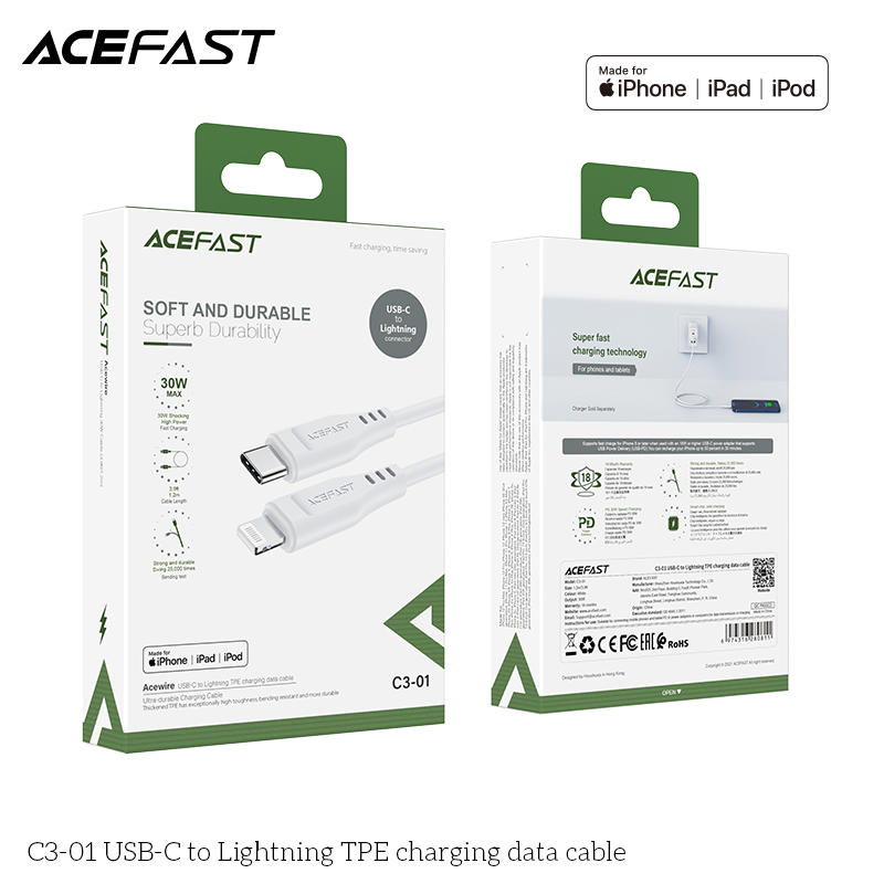 Cáp ACEFAST C3-02 , dòng điện lên đến 2,4A, chiều dài 1.2m, chất liệu TPE, chứng nhận M.F.I Thông số kỹ thuật: - - Chiều dài: 1.2m. Trọng lượng: 30g. - - Chất liệu vỏ bên ngoài: