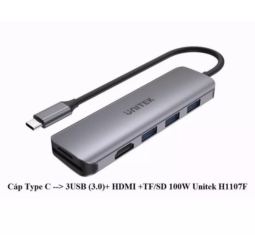 Bảo Hành : 12 tháng Thông số kỹ thuật CÁP TYPE-C -> 3 USB 3.0 + HDMI + TF/SD UNITEK H1107F Cổng vào : Type-C (5Gbps) Cổng ra : 3 USB 3.0 (5Gbps),