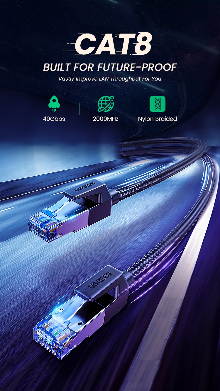 Cáp mạng Cat8 đúc sẵn bọc dù dài 10M Ugreen 30795 băng thông ổn định lên đến 2000MHz: Cáp ethernet UGREEN cat 8 hỗ trợ băng thông lên đến 2000MHz, đảm bảo tốc độ mạng ổn định cho bạn lướt Internet, chơi game trực tuyến, truyền phát video, nghe nhạc và hơn thế nữa mà không gặp phải tình trạng mạng chậm. Ngay cả trong giờ cao điểm mạng, bạn có thể lướt Internet linh hoạt với Cat8.