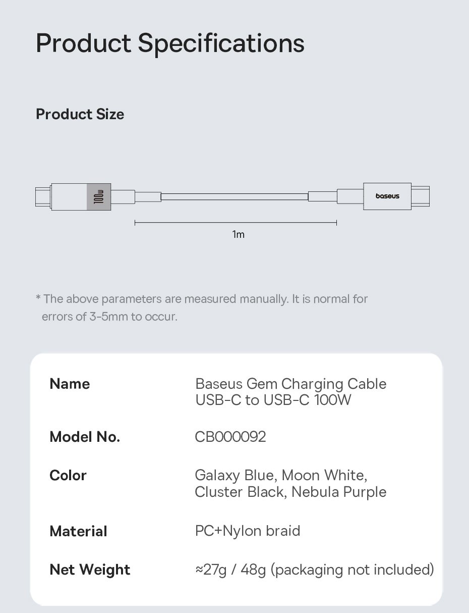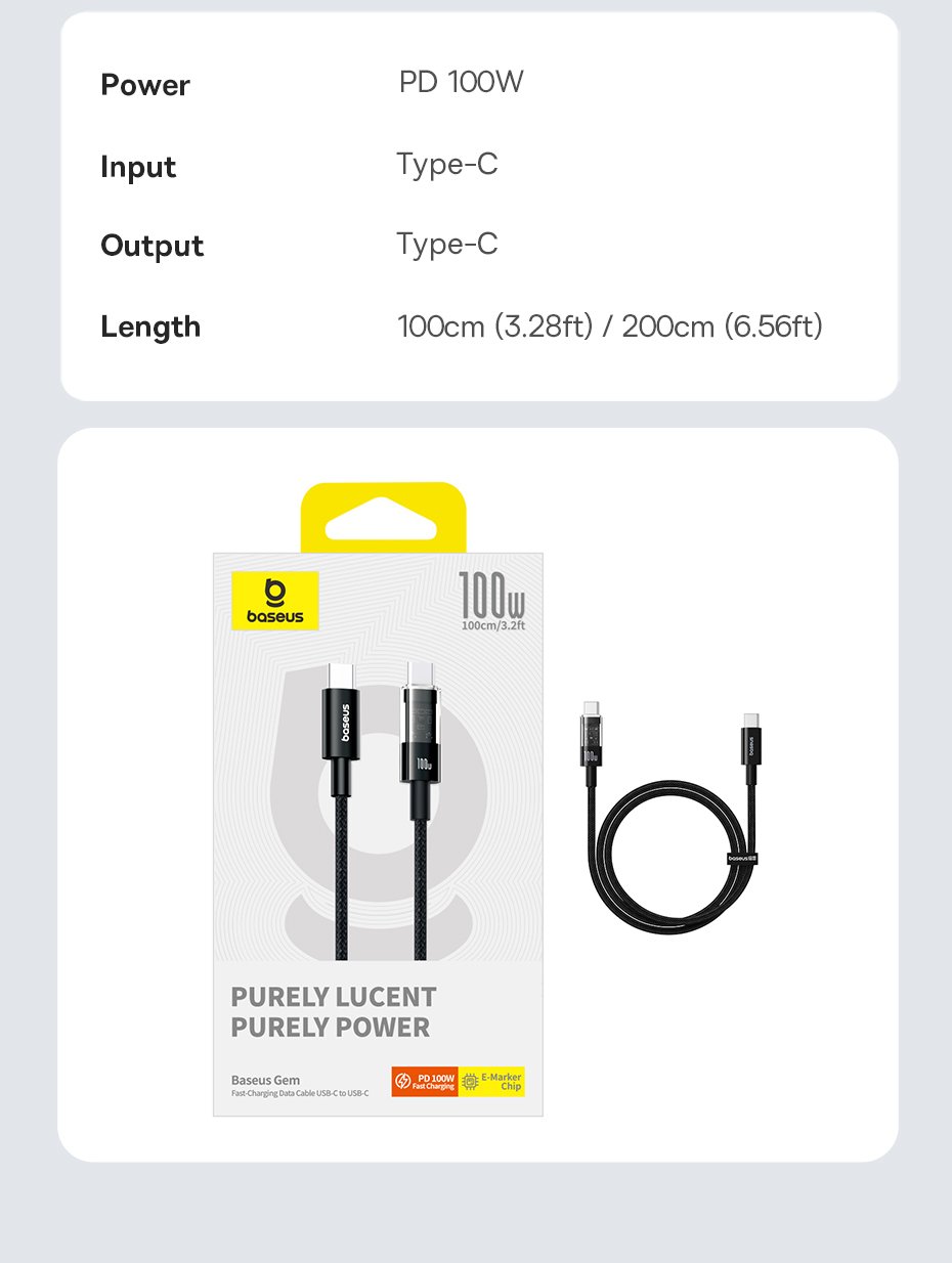 ✨Cáp sạc nhanh Type C to Type C 100W Baseus Gem Fast-Charging Data Cable - Hàng chính hãng