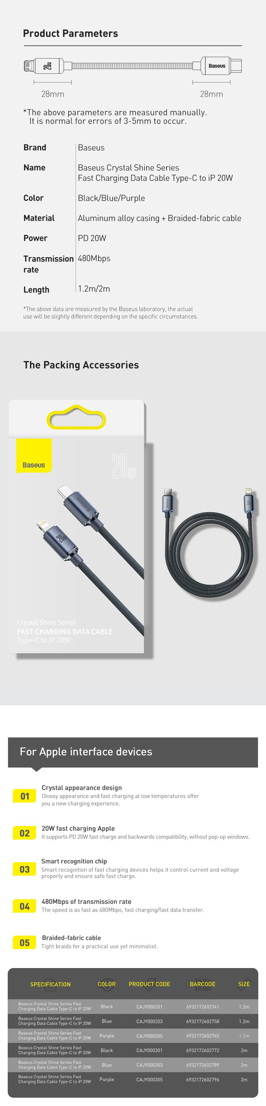- Tên sản phẩm: Ba-se-us Crystal Shine Series Fast Charging Data Cable C to Lai-nin 20W