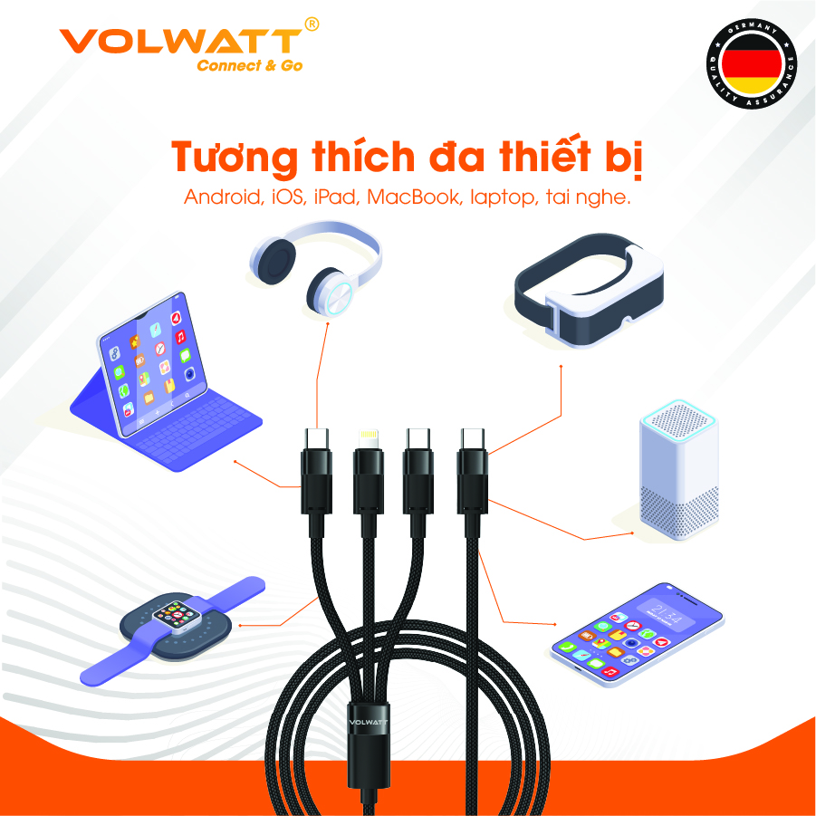 ✨Cáp sạc siêu nhanh 3 đầu Volwatt GE-S36-S3 hàng chính hãng | Type-C ra C (100W)+C(15W)+L(27W), dây bện 1.5m | BH 12 tháng