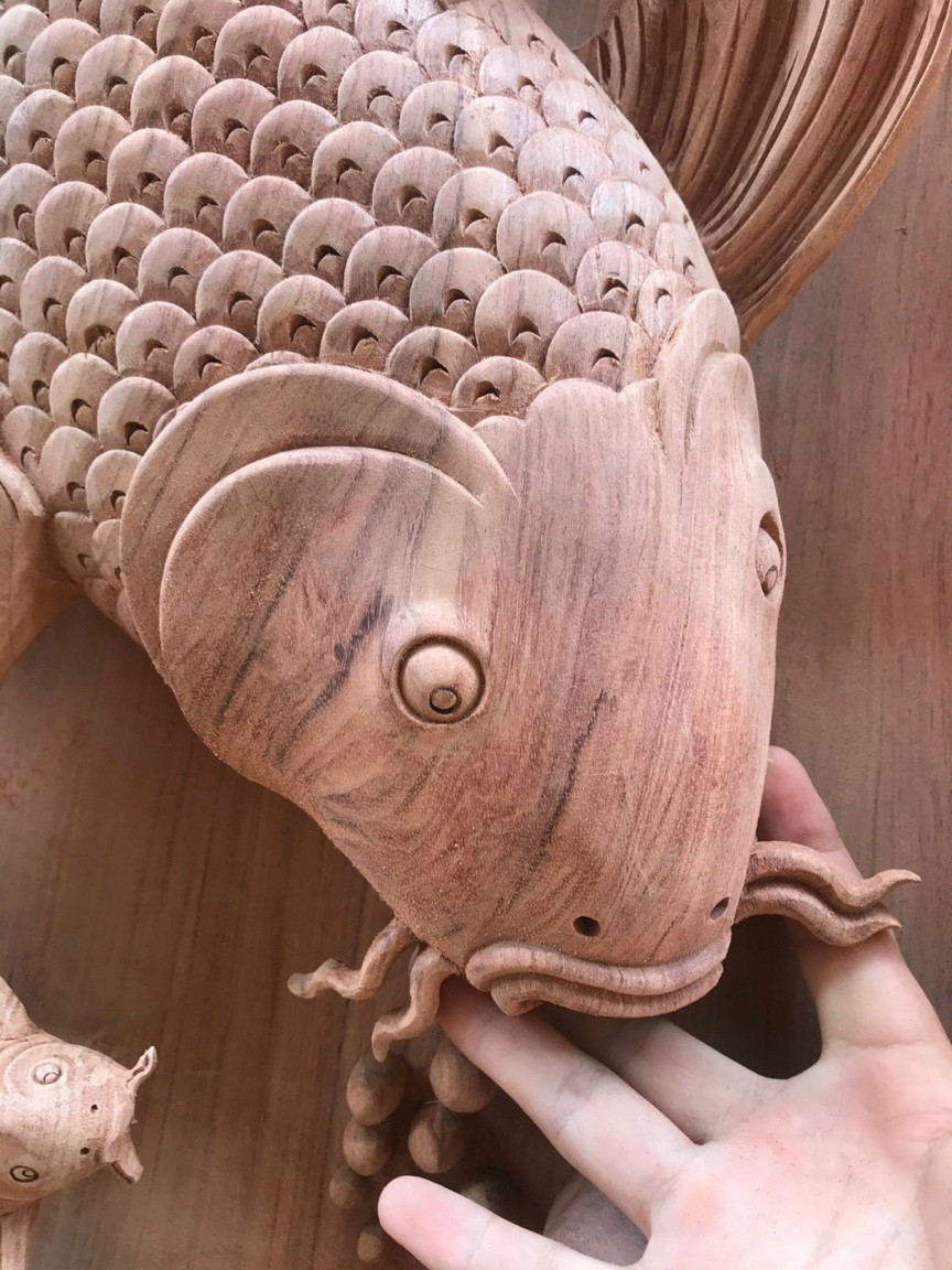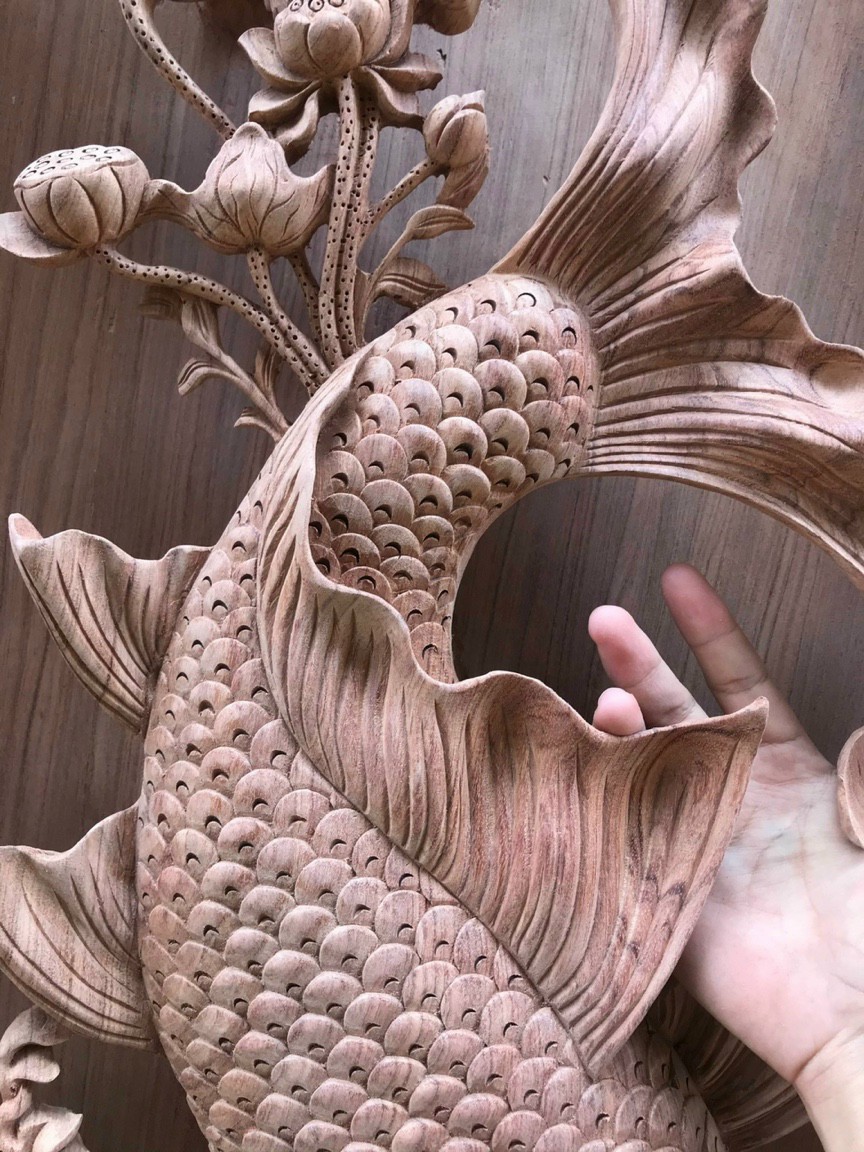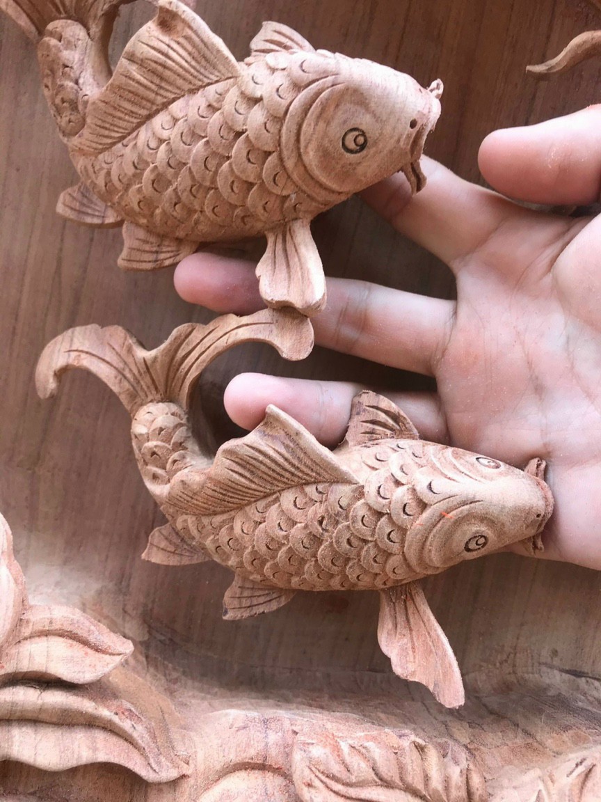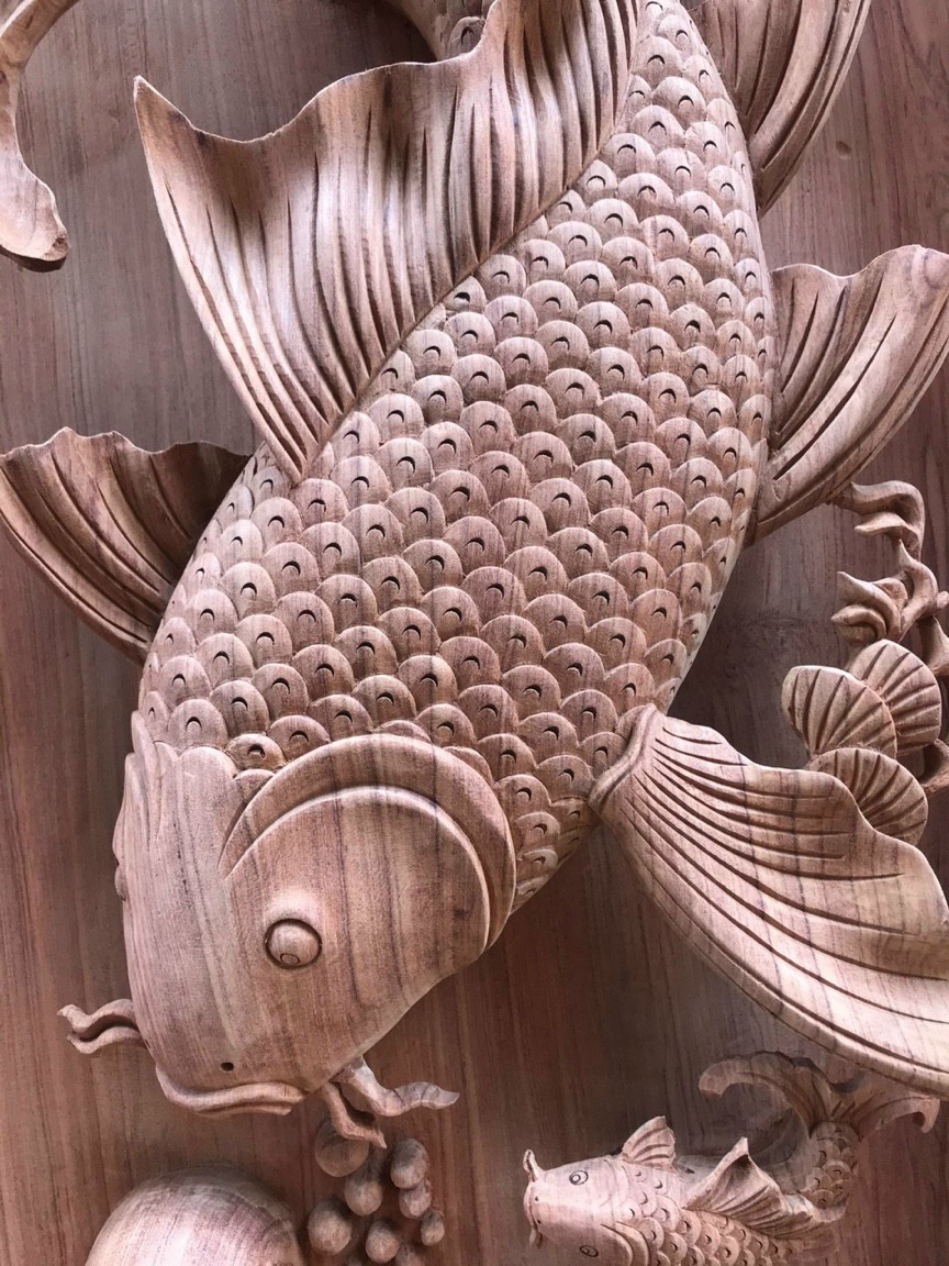 _ Cặp tranh lý ngư vọng nguyệt được trạm khắc ?vô cùng tỉ mỉ tinh sảo kỳ công .Đi hầu hết tất cả mọi chi tiết ?góc ngách nội dung hoa văn của tượng đều được gọt tỉa chỉnh sửa kênh bóng sắc nét ?như mắt mũi lườn lây đều từ đầu xuống đuôi ?và các chi tiêt khác hoàn toàn bằng tay thủ công .Đồng thời cặp tranh được kiểm định kỹ lưỡng khắt khe ?như cho vào thẩm sấy cho gỗ khô kiệt .Mục đích trống dập nứt vênh mo mối mọt ?kết hợp với trà nhám ?đánh giấy giáp nhiều nước sờ mát lạnh ?Rồi cho vào phun lót làm bóng mờ để giữ lại mầu sắc vân gỗ tự nhiên .Cặp tranh lý ngư vọng nguyệt được làm và hoàn thiện do bàn tay khối óc tài hoa .Từ những người thợ dầy rặn kinh nghiệm ?trong làng nghề truyền thống .Chính vì thế cặp tranh đã đáp ứng đầy đủ tất cả mọi tiêu trí cần thiết như ( Đẹp bền rẻ ) thẩm mỹ nghệ thuật với chất lượng tuyệt vời