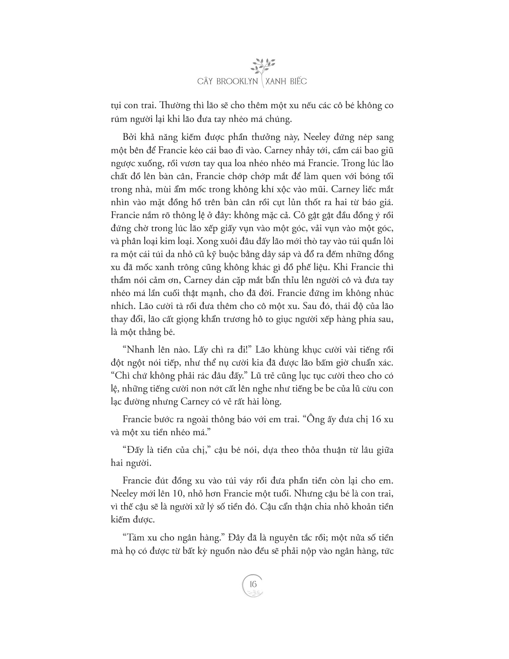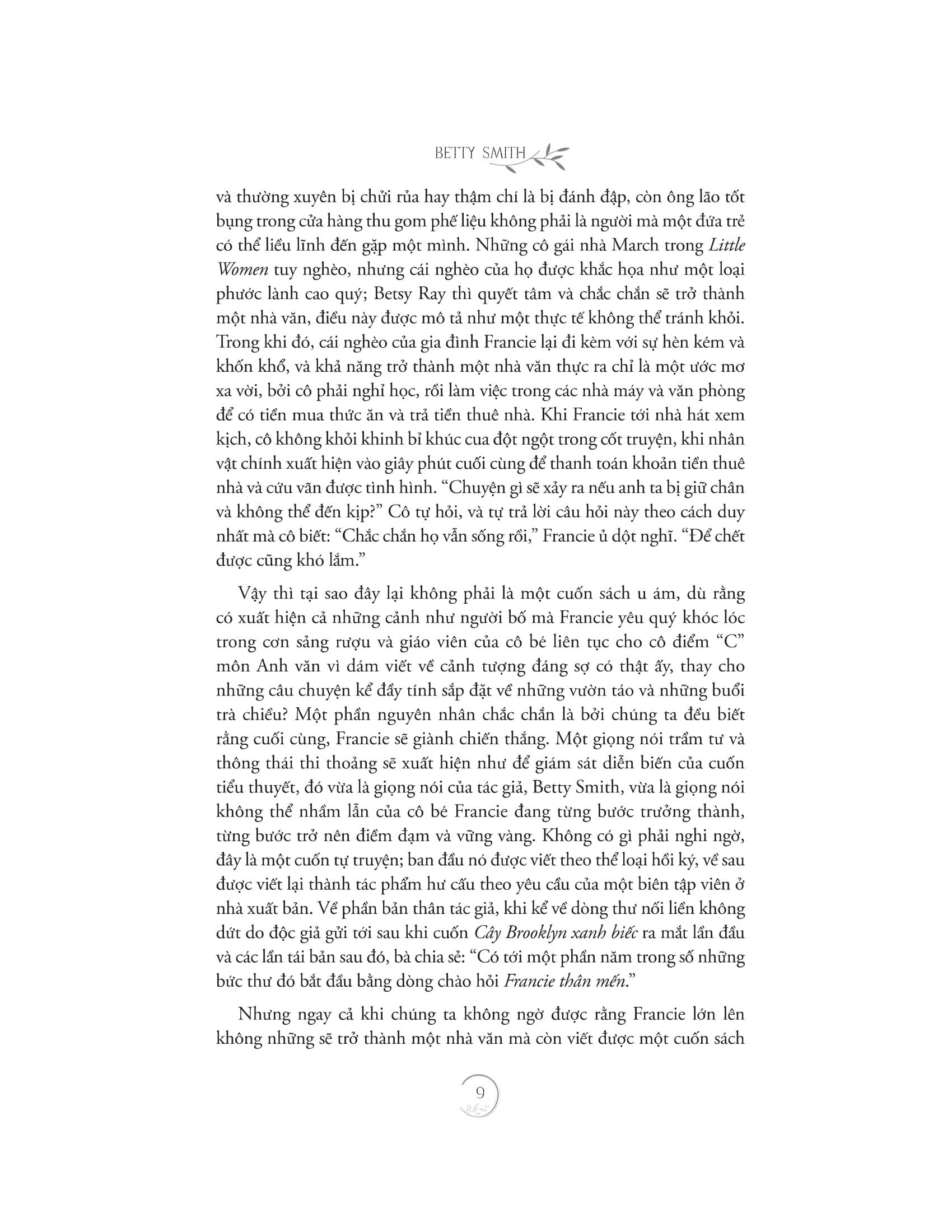 2. “Người ta cứ nghĩ rằng hạnh phúc là điều gì thật xa xôi,” Francie nghĩ, “một điều thật phức tạp và khó đạt được. Thế nhưng, thật ra chính những điều nhỏ bé đã tạo nên hạnh phúc; một chỗ trú khi trời mưa – một ly cà phê đậm nóng hổi khi ta buồn bã; đối với người đàn ông, một điếu thuốc cũng đủ mãn nguyện; một cuốn sách để đọc lúc cô đơn – hay chỉ là được ở bên người mà ta yêu. Chính những điều đó đã tạo nên hạnh phúc.”