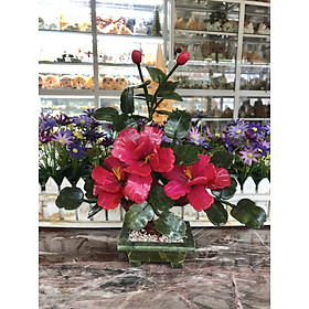 Chất liệu: Hoa là đá cẩm thạch huyết; Lá và chậu là đá ngọc Ấn Độ Kích thước: Cao 30cm x Dài 27 cm Khối lượng: 1,06 kg Mỗi cây gồm 3 bông hoa Ý