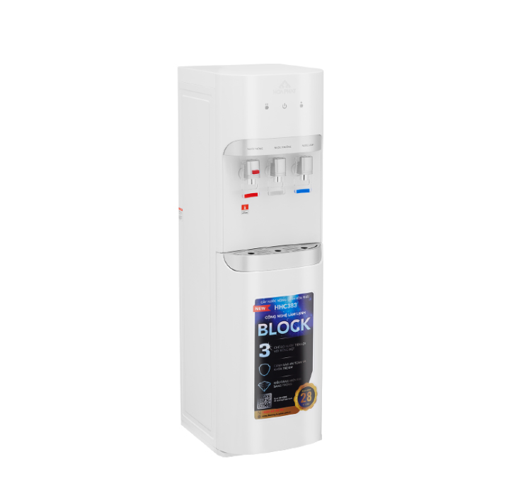 - Bảo hành vượt trội lên tới 28 tháng CÂY NƯỚC NÓNG LẠNH HÚT BÌNH HHC383 Là cây nước nóng lạnh Hòa Phát thế hệ mới với 3 chế độ nước - 3 vòi Nóng, Lạnh, Thường, sản phẩm sử dụng công nghệ BLOCK làm lạnh nước nhanh và sâu tới 5 độ C, công suất làm nóng cao vượt trội cho nước nóng tới 95 độ chỉ sau 2 phút. Được thiết kế với ngoại tinh tế, sang trọng, vỏ nhựa ABS sơn tĩnh điện trơn láng, cây nước nóng lạnh hút bình Hòa Phát sẽ làm đẹp thêm không gian gia đình bạn. NƯỚC LẠNH SÂU TỚI 5 ĐỘ C VỚI CÔNG NGHỆ BLOCK ƯU VIỆT Hệ thống lạnh dùng công nghệ Block hiệu suất cao BLOCK R134a giúp máy làm lạnh nước vượt trội, nước lạnh nhanh hơn chỉ trong 30 phút và lạnh sâu tới 5 độ C, đồng thời tiết kiệm điện năng và vận hành bền bỉ hơn. Cùng dung tích bình lạnh lên tới 3,3 lít, cây nước nóng lạnh Hòa Phát đảm bảo khả năng cung cấp nước lạnh liên tục đáp ứng mọi nhu cầu, phù hợp với mọi không gian như gia đình, văn phòng, trường học, công xưởng, bệnh viện, nơi công cộng,... LÀM NƯỚC NÓNG NHANH CHỈ SAU 2 PHÚT VỚI CÔNG SUẤT CỰC KHỎE Cây nước nóng lạnh Hòa Phát thế hệ mới đều có mức công suất bình nóng 580W giúp làm nước nóng nhanh tức thì, thời gian làm nóng dưới 2 phút. Sau mỗi lần tắt công tắc làm nóng, lớp bảo ôn giữ nhiệt lên tới 2,5 giờ mới cần đun lại. Với mức công suất như vậy, cây nước sẽ luôn cung cấp nước nóng nhanh chóng mà vẫn đảm bảo tiết kiệm điện. 03 CHẾ ĐỘ NƯỚC TIỆN LỢI, PHÙ HỢP MỌI NHU CẦU Cây nước nóng lạnh Hòa Phát có tối đa lên tới 3 chế độ nước “Nóng - Nguội - Lạnh” với 3 vòi riêng biệt, đa công năng phù hợp với nhiều nhu cầu sử dụng như nước nóng pha trà hay cà phê, pha mì tôm, nước lạnh giải khát, nước nguội uống ngay,... Đây là phiên bản mới và hiện đại nhất trên thị trường hiện nay. TÍCH HỢP TÍNH NĂNG AN TOÀN Cây nước nóng lạnh của ĐMGD Hòa Phát được trang bị đầy đủ tính năng an toàn như: Cảnh báo hết nước, bảo vệ quá nhiệt kép, khóa trẻ em đối với vòi nước nóng, an toàn tuyệt đối trong quá trình sử dụng. BẢO HÀNH LÂU NHẤT THỊ TRƯỜNG TỚI 28 THÁNG Với định vị "Bền - Chuẩn Hòa Phát", các cây nước nóng lạnh trong BST Thế hệ mới đều có thời gian bảo hành vượt trội lên tới 28 tháng, khách hàng an tâm, thoải mái sử dụng lâu dài. THIẾT KẾ HIỆN ĐẠI, TINH TẾ Sở hữu thiết kế tối giản, hiện đại với màu trắng nguyên khối, nhỏ gọn dễ dàng xếp vừa mọi vị trí, cây nước nóng lạnh hút bình Hòa Phát sẽ giúp không gian gia đình thêm phần tinh tế. Bên cạnh đó khung tủ làm từ nhựa ABS nguyên sinh giúp bề mặt nhẵn bóng, sắc nét, tăng độ cứng cáp cho sản phẩm