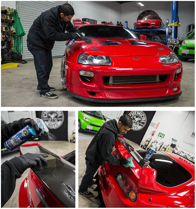 - Gấp 4 khăn microfiber chuẩn (40x40cm) lại và xịt dung dịch quick detailer trực tiếp lên sản phẩm hoặc xịt lên khăn microfiber