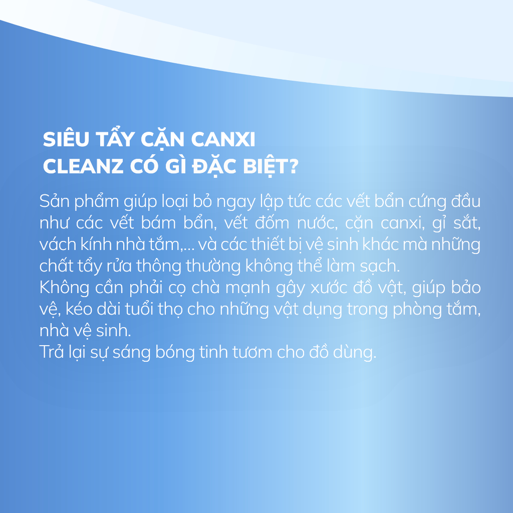 - Sau một thời gian sử dụng những chiếc vòi hoa sen hay bồn inox của bạn đã bắt đầu cáu bẩn,ố vàng. Nước tẩy rửa thông thường cặn canxi không sạch hoặc bị bong hết lớp ngoài cùng nếu vệ sinh không đúng cách. CleanZ loại bỏ các dấu vết của nước và thậm chí cả những mảng bám vôi hóa cũ.