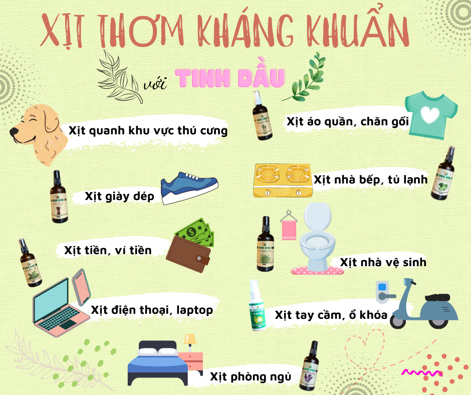 - Xịt vào nơi côn trùng ở hoặc không gian nơi bạn sinh hoạt để xua đuổi côn trùng. Tùy mục đích sử dụng để chọn tinh dầu phù hợp.