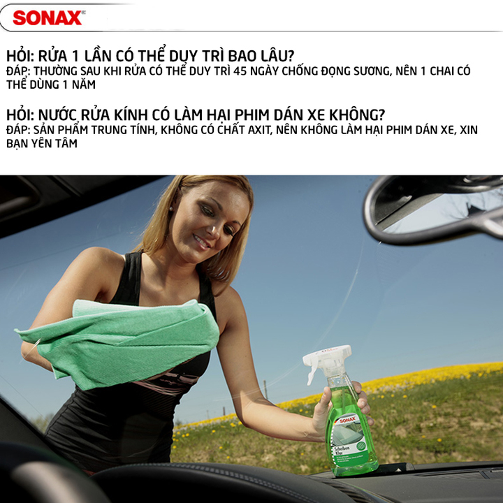 - Nước lau Làm sạch và trong kính Sonax Clear glass tác dụng ngay lập tức giải phóng kính chắn gió và đèn pha khỏi côn trùng, chất bẩn, các màng sơn mờ, lượng khí thải và dư lượng khói thuốc lá.