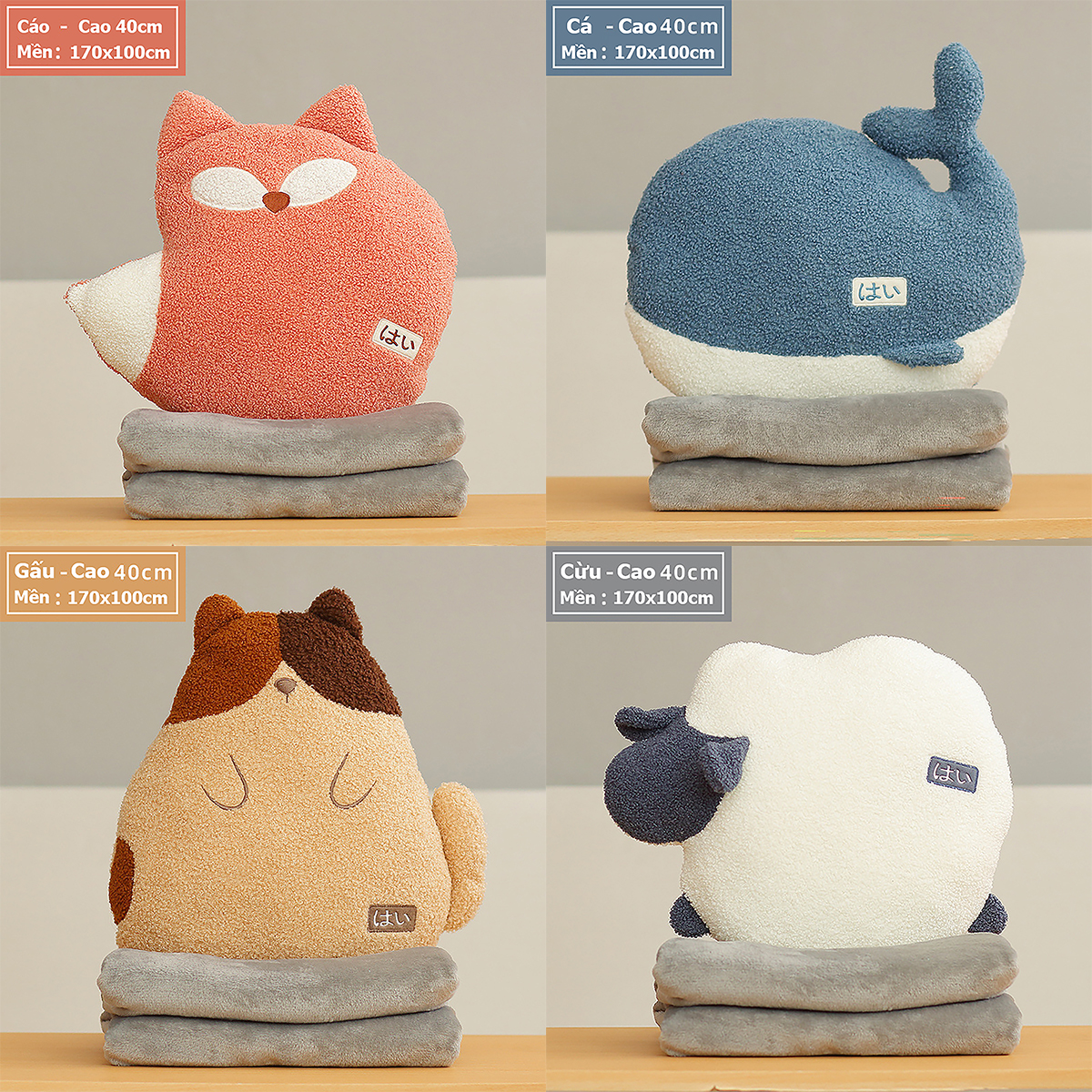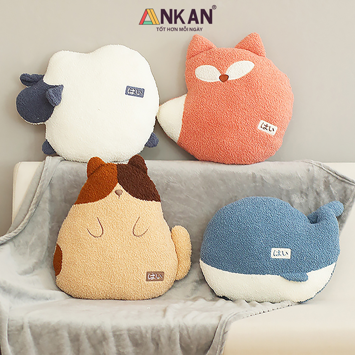 Bộ Chăn Gối Văn Phòng Đa Năng Hình Thú Gấu Bông Dễ Thương, Tiện Lợi Cho Bé Đi Học Và Du Lịch CHĂN GỐI VĂN PHÒNG ANKAN CÓ GÌ ĐẶC BIỆT Thiết kế hình thú xinh xắn, phù hợp làm quà sinh nhật, quà tặng bạn bè, người yêu, đồng nghiệp. Đa năng 3 trong 1: vừa là gối ôm – gối tựa lưng – gối luồn tay, kèm chăn êm giữ ấm. Sử dụng tiện lợi cho nhiều mục đích: ngủ trưa văn phòng, đi học, đi làm, du lịch. Trên sản phẩm có nhãn chữ “はい” (hai) – nghĩa là “Vâng” trong tiếng Việt, mang đến cảm giác dễ thương, tích cực và gần gũi theo phong cách Nhật Bản. CAM KẾT TỪ ANKAN Sản phẩm đúng mô tả, đúng mẫu, đúng kích thước. Đổi trả trong 15 ngày nếu khách không hài lòng. Hoàn tiền 100% nếu sản phẩm lỗi do nhà sản xuất. Đóng gói sạch sẽ, an toàn, giao hàng nhanh chóng. THÔNG SỐ KỸ THUẬT Kích thước gối: 40 x 35 cm. Kích thước chăn: 100 x 170 cm (được lồng gọn trong gối). Chất liệu vỏ: vải nhung siêu mềm. Chất liệu ruột: bông PP cao cấp, an toàn cho da. Trọng lượng: khoảng 800g. Có 4 kiểu dáng để bạn lựa chọn là Cáo Đỏ, Cá Voi Xanh, Cừu Trắng và Gấu Nhật Bản ƯU ĐIỂM NỔI BẬT Vải nhung mềm mịn, thoáng khí, dễ giặt sạch.