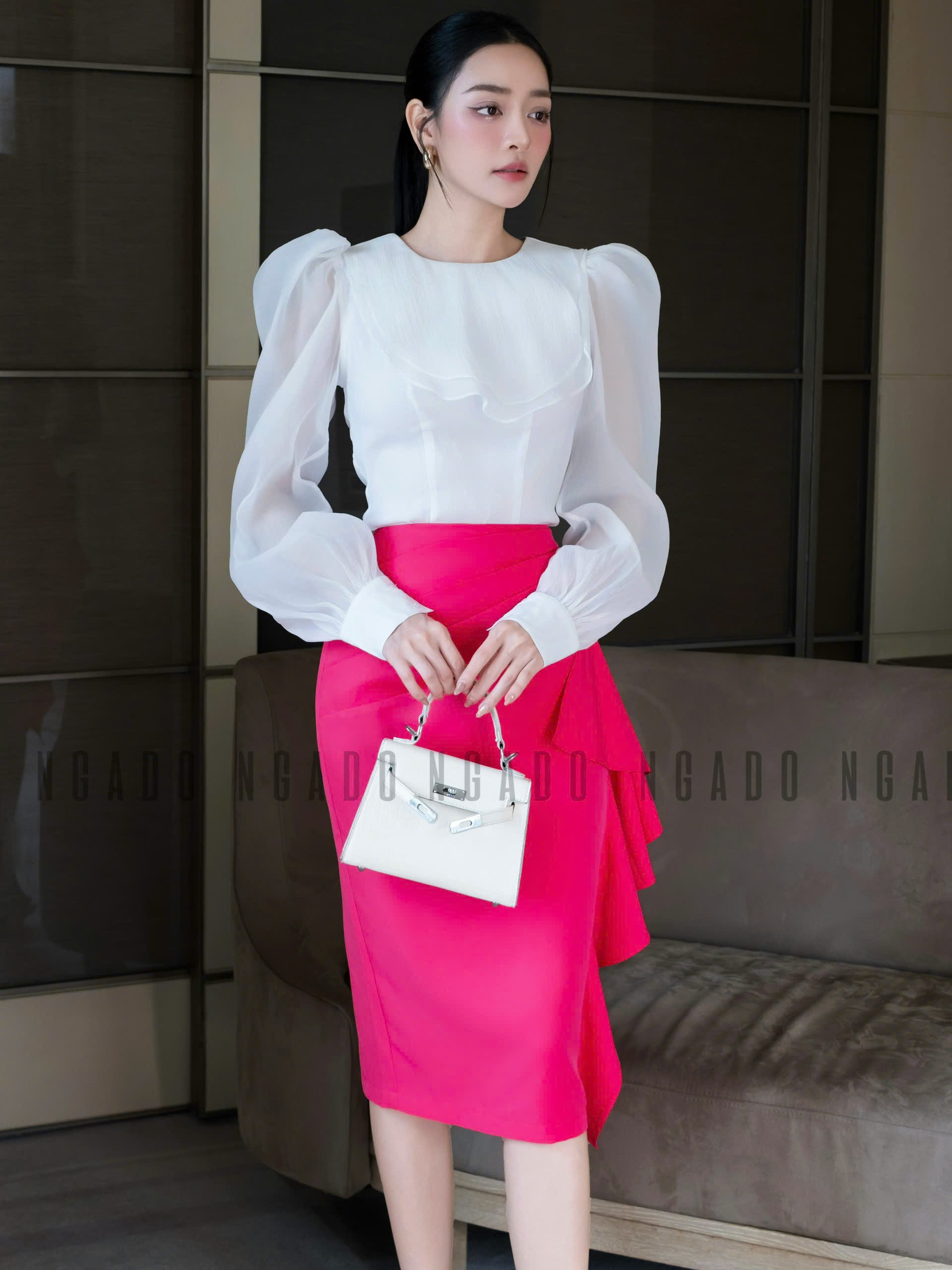 Phối màu chân váy xòe phồng hông với áo cổ sen to bản | Mặc đẹp Thời Trang Thủy