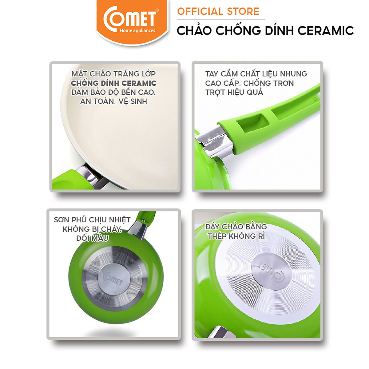 THÔNG TIN KỸ THUẬT: 1.Thương hiệu: Comet  2.Sản phẩm: Chảo chống dính 3.Mã sản phẩm: CH11-26 4.Kích thước: 26cm 5.Chất liệu: Nhôm cao cấp, chống dính ceramic 6.Công dụng: Chiên, xào 7.Sản xuất tại: Trung Quốc MÔ TẢ: -Chảo ceramic 02 lớp chống dính thương hiệu COMET là món quà thiết thực cho các bà nội trợ, giúp việc nấu nướng thuận lợi và có nhiều lựa chọn hơn, phù hợp với mọi không gian bếp. -Chảo chống dính Comet CH11-26 chịu được nhiệt độ lên đến 300 độ C, giúp bạn tiết kiệm điện năng. -Lòng chảo sâu, với chất liệu ceramic 02 lớp chống dính, dễ dàng nấu nướng và vệ sinh sản phẩm. -Tay cầm Chảo chống dính Comet CH11-26 cách nhiệt, chắc chắn, an toàn khi sử dụng. -Chảo chống dính Comet CH11-26 sử dụng được tất cả các loại bếp khác nhau. -Chảo chống dính Comet CH11-26 được thiết kế với màu sắc đẹp mắt, đem đến không gian sang trọng cho gian bếp nhà bạn. -Sản phẩm có nhiều màu - giao màu ngẫu nhiên. -SẢN PHẨM KHÔNG DÙNG CHO BẾP TỪ .