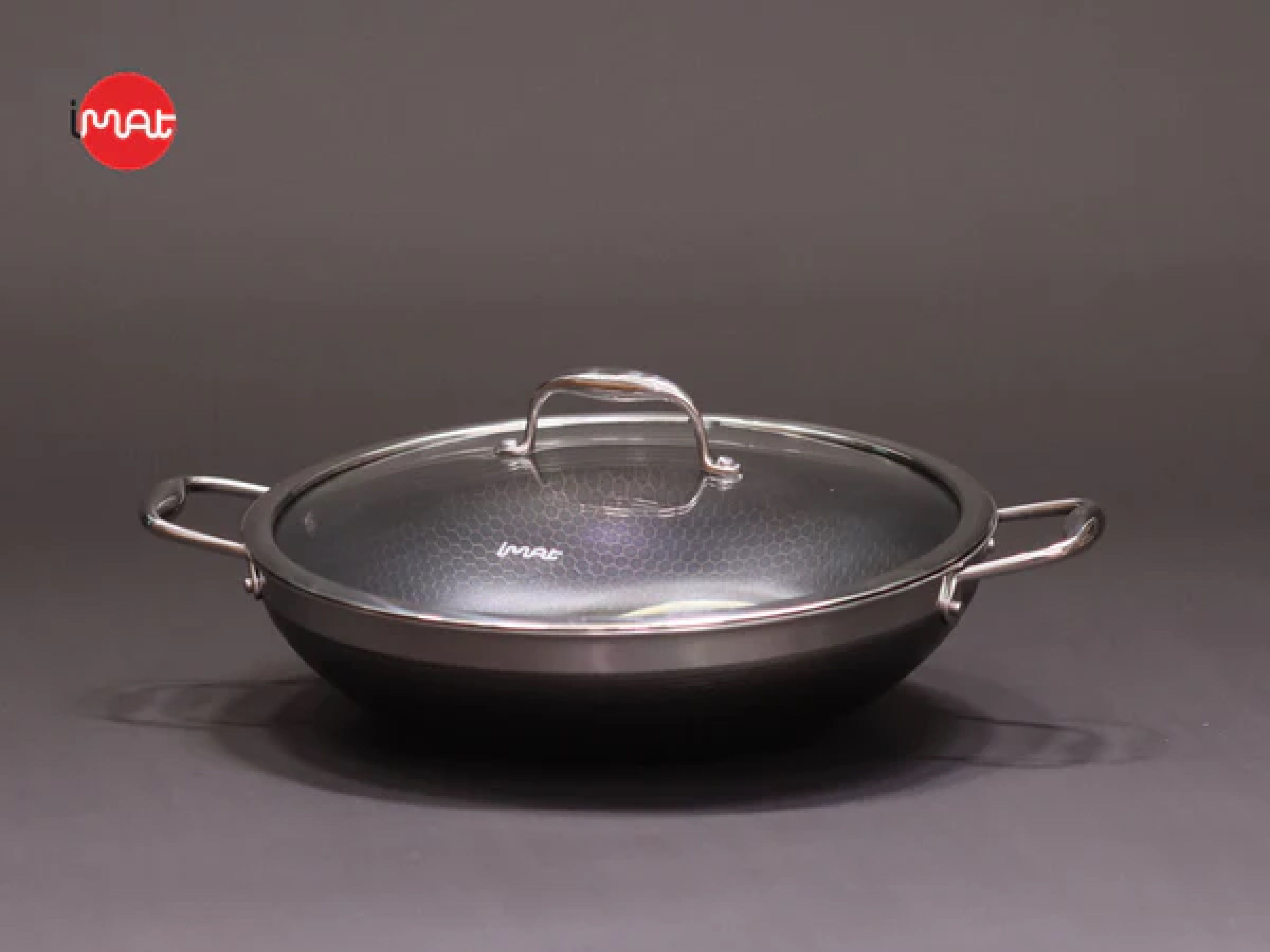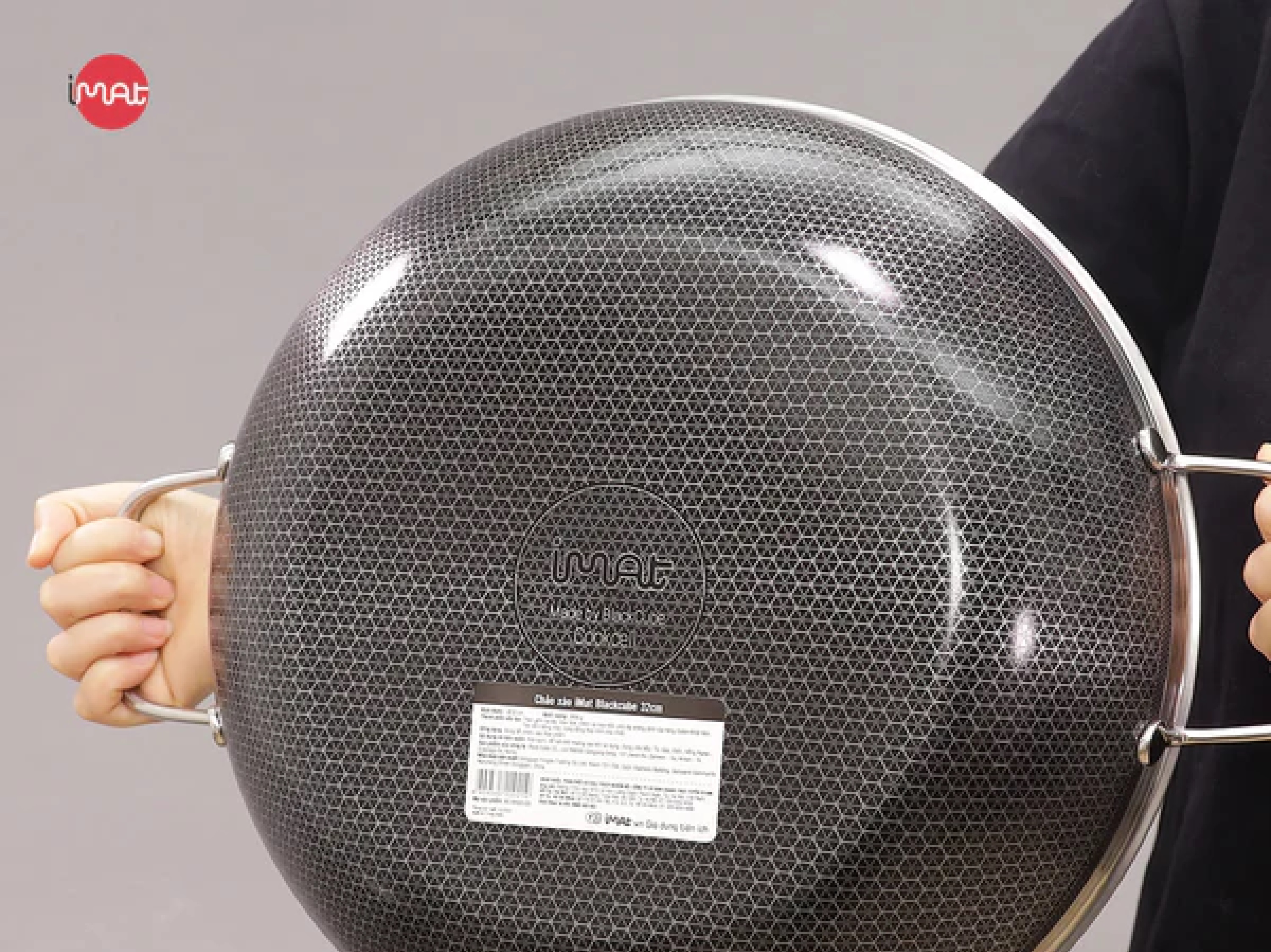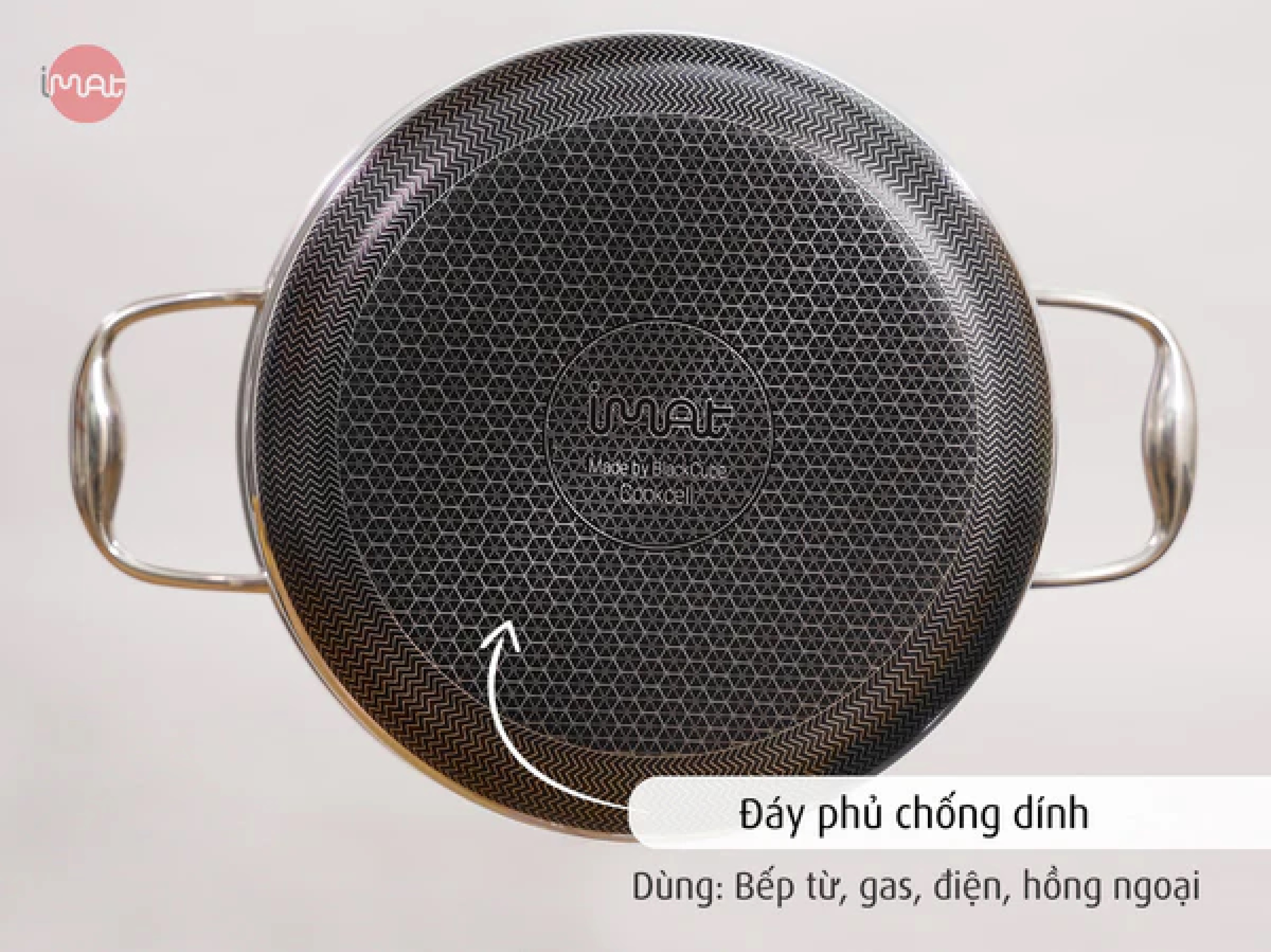 Chảo đa năng iMat Hybrid có tay cầm bằng inox đúc rỗng với công nghệ đặc biệt ghép nối với thành chảo nên không nóng, nhẵn và sáng bóng nên dễ dàng rửa sạch và luôn đẹp, sang trọng. Riêng với chảo xào 32cm có hai quai cầm hai bên.