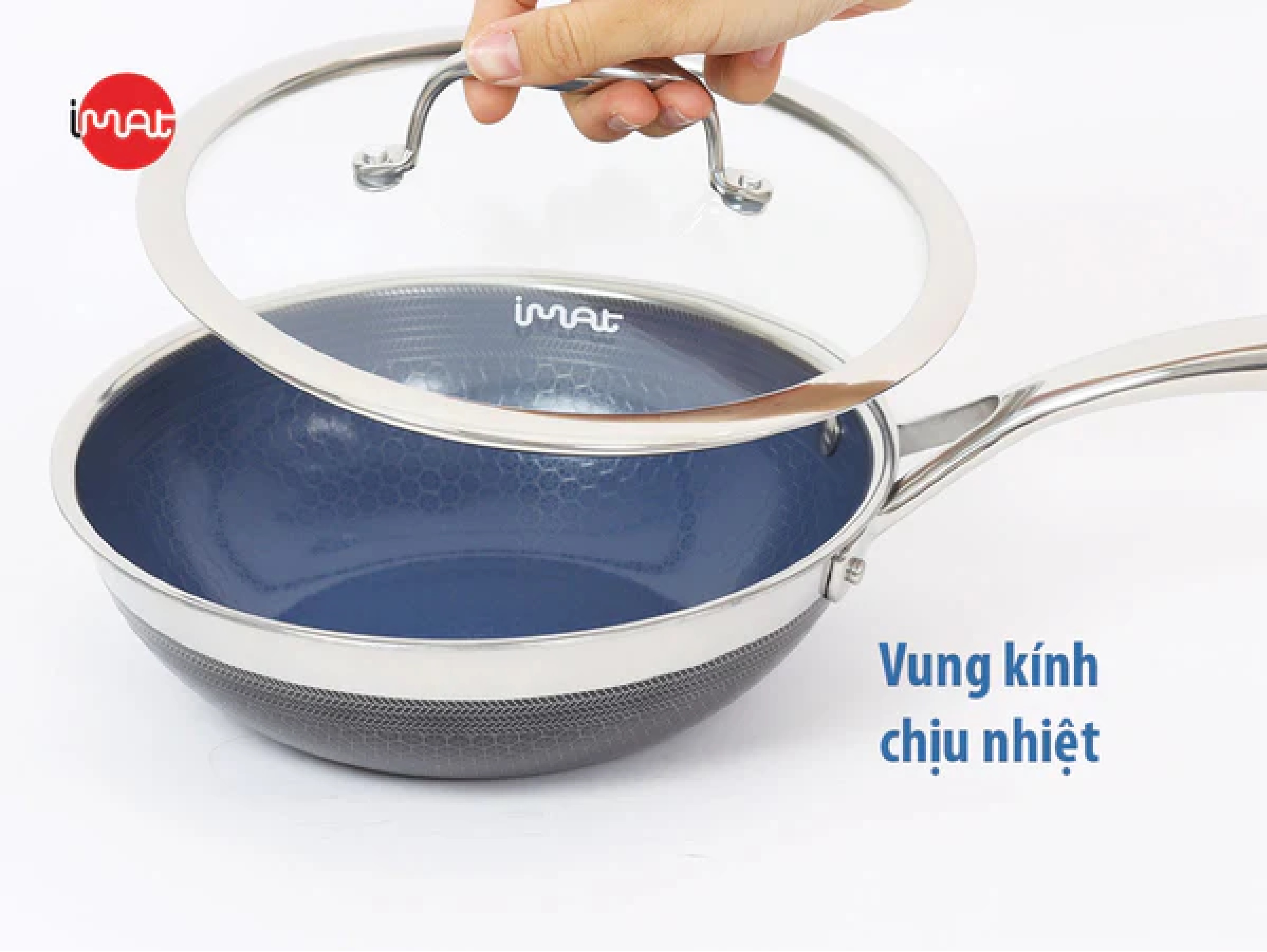 Vung bằng thuỷ tinh chịu nhiệt kết hợp với các chi tiết inox giúp dễ quan sát thực phẩm trong khi nấu. Logo iMat được in lên phần thuỷ tinh. Nút thoát hơi to bọc inox an toàn. Đối với chảo 28cm, phần inox sẽ lớn hơn thuỷ tinh.