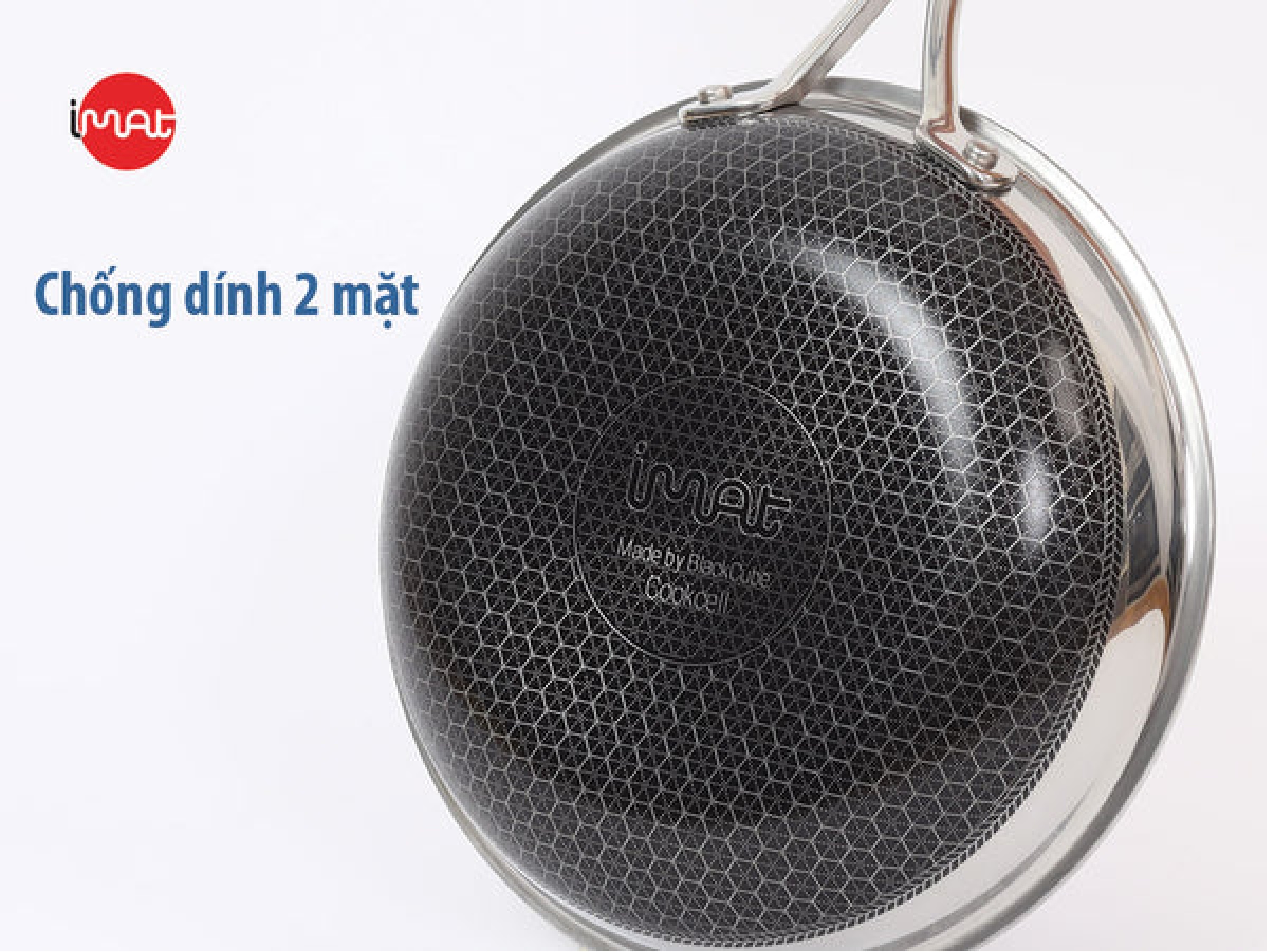 Chảo đa năng iMat Hybrid là sự kết hợp giữa chất liệu inox và bề mặt chống dính ứng dụng công nghệ Blackcube, chứa các trụ inox trồi cao giúp dẫn nhiệt tốt đến thực