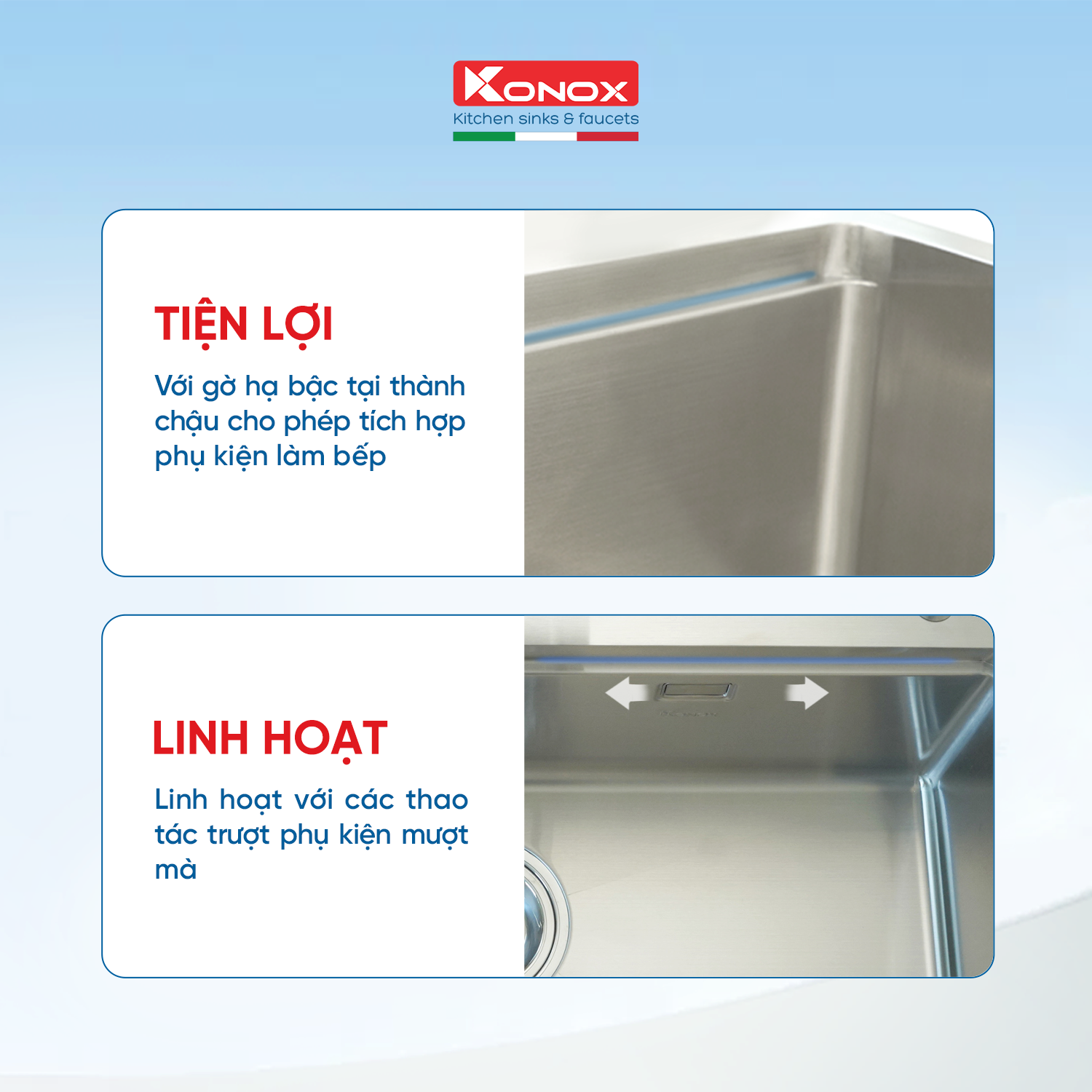 ✨Chậu rửa bát inox Konox, Topmount Series, Model KN11650TD - Bàn Trái, Inox 304AISI tiêu chuẩn Châu Âu, Hạ Bậc tích hợp, 1160x550x220mm, Bảo hành chính hãng 10 năm