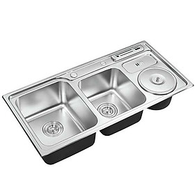 Kích thước hố chậu : Hố bên trái chậu có kích thước : 310 x 365 x230 mm, hố bên phải chậu có kích thước : 270 x 310 x 230 mm. Hố rác đường kính 20cm