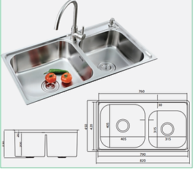 Inox 304 Kích thước chậu: 820x450mmx230mm Kích thước 2 hố: 370x380x230mm KT khoét đá: 790x425mm Kích thước 2 hố: 750mm
