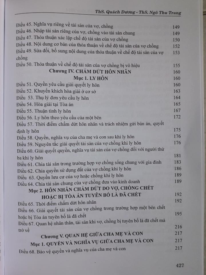 Mục lục: Chương 1: Những quy định chung Chương 2: Kết hôn Chương 3: Quan hệ giữa và chồng Chương 7: Cấp dưỡng Chương 8: Quan hệ hôn nhân và gia đinh có yếu tố