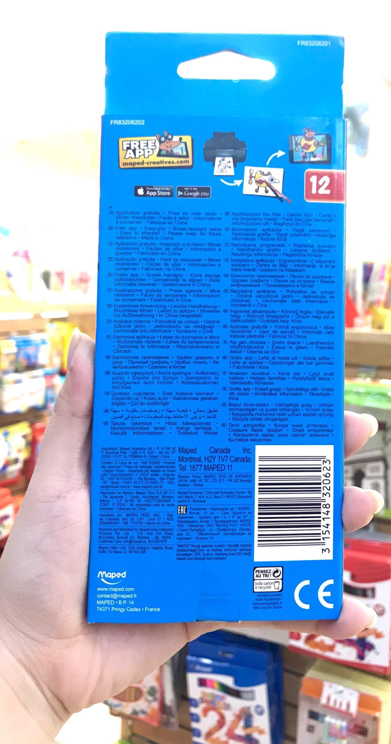 Chì màu 12 832062 có 12 cây được đựng trong hộp giấy. - Sản phẩm được làm từ nguyên liệu cao cấp, cho màu sắc tươi sáng như thật. - Bút chì màu Maped là thương hiệu nổi tiếng đến từ nước Pháp, không chứa hóa chất độc hại, rất an toàn cho sức khỏe của trẻ nhỏ. - Đầu bút vót nhọn, thân bút hình trụ - Lõi chì màu được đặt cố định giữa trung tâm, bao quanh là chất liệu gỗ khít chặt, khi chuốt không bị gãy, lõi chì màu cứng, dù trẻ có ấn mạnh xuống cũng khó bị gãy. - Màu của bút rất sắc nét, mịn, khó bị phai theo thời gian, giúp trẻ vẽ nên những bức tranh thật đẹp theo ý thích. - Bút chì có thiết kế đặc biệt với thân hình trụ và có độ dài vừa phải, vừa vặn với tay trẻ, đồng thời cho thời gian sử dụng bút được lâu hơn. - Bút được đựng trong hộp giấy mang tính tiện dụng cao, giúp trẻ cất bút gọn gàng vào hộp sau khi sử dụng, tránh tình trạng thất lạc. - Hộp gồm 12 màu giúp trẻ tập làm quen với nhiều loại màu sắc khác nhau. Việc làm quen và sử dụng màu sắc, không chỉ đơn giản giúp trẻ cảm thấy vui và thích thú, mà còn là quá trình thúc đẩy phát triển giác quan, trí tưởng tượng không ngừng của trẻ. Với bút chì màu Maped, trí tưởng tượng của trẻ sẽ được kích thích tối đa, mang đến cho trẻ khả năng sáng tạo vô hạn. Trẻ tha hồ bày tỏ những suy nghĩ, những ước muốn qua những hình vẽ độc đáo và đáng yêu, tạo ra những tác phẩm nghệ thuật riêng của trẻ .