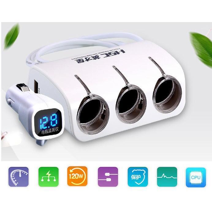Chia tẩu Ô tô 1 ra 3 công suất 120W có cổng sạc USB và báo điện áp